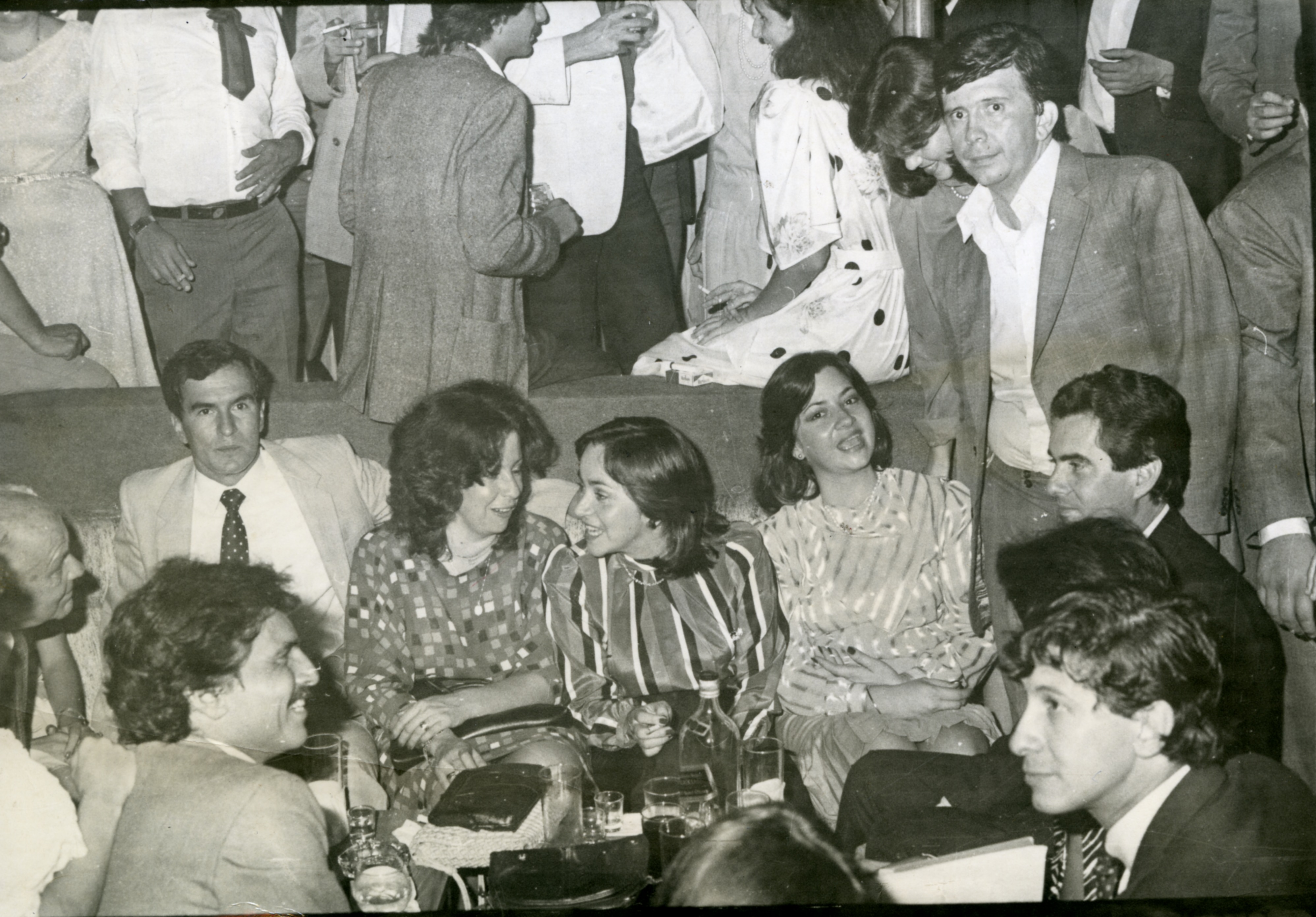 Se observa un grupo de personas sentadas alrededor de una mesa.Al reverso de la fotografía se anexa recorte: "Al compás de la música, el más sofisticado equipo electrónico de luces le hará bailar de seguido con 1.000 vatios de potencia y 20.000 en luces consistentes en juegos tridimensionales, arañas, chorros, neón, inercambiadoras de ambientes, bolas, reflectores, más de 150 bombillas tongolete, strovers y muchos más, jugarán toda la noche con la música al ritmo de Epsilón."