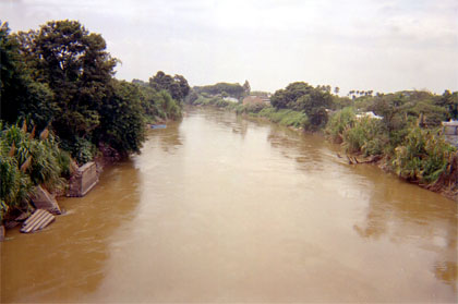 Primer plano de río Cauca. Punto de fuga. Vegetación en laterales.
