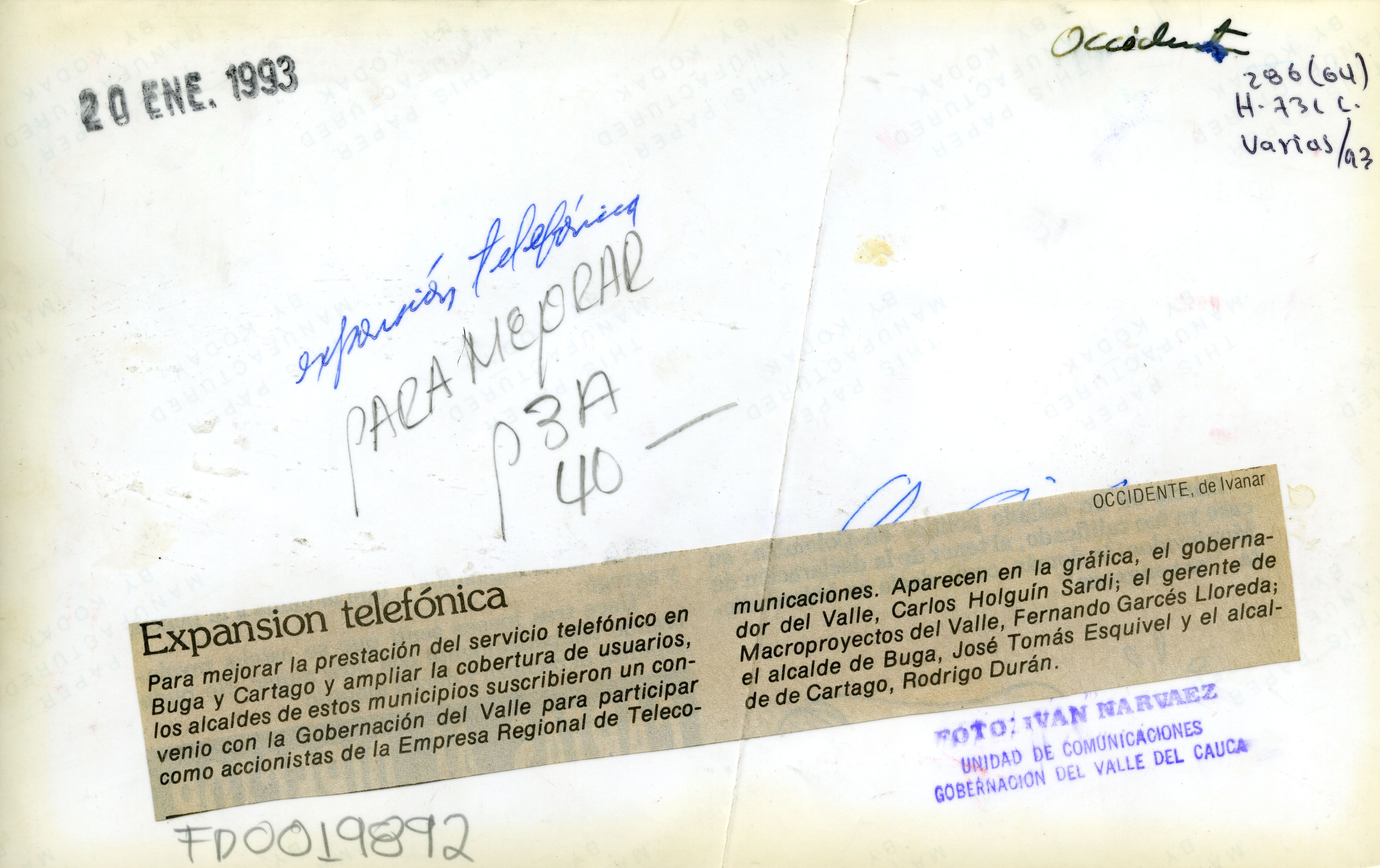 Reverso: para mejorar la prestación del servicio telefónico en Buga y Cartago y ampliar la cobertura de usuarios, los alcaldes de estos municicpios suscribieron un convenio con la Gobernación del Valle para participar como accionistas de la Empresa Regional de Telecomunicaciones. Aparecen en la gráfica, el gobernador del Valle, Carlos Holguín Sardi; el gerente de Macroproyectos del Valle, Fernando Garcés Lloreda; el alcalde de Buga, José Tomás Esquivel y el alcalde de Cartago, Rodrigo Durán