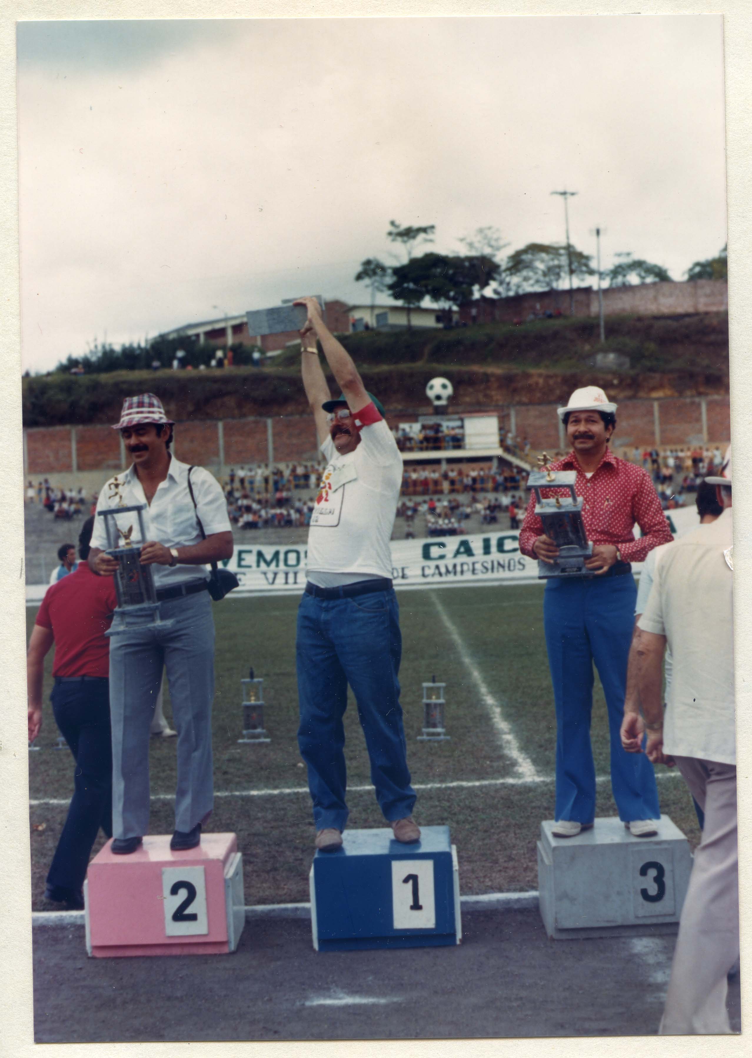 Sevilla, Valle del Cauca. Fundado en 1903, por Heraclio Uribe y Colonos antioqueños y caldenses. Nombres: San Luis. Municipio desde 1914. Economía importante en agricultura, caficultura, riqueza natural, comercio, la minería, explotación forestal, industria, etc. Observamos en la imagen, la premiación y entrega de trofeos durante los VI Juegos Campesinos de los Caficultores