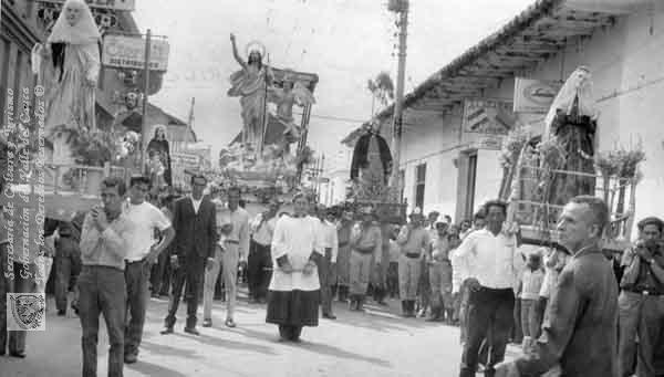 Procesión de semana santa. Nótese los pasos compartidos por los bomberos voluntarios y por hombres del pueblo. Florida, 1972.