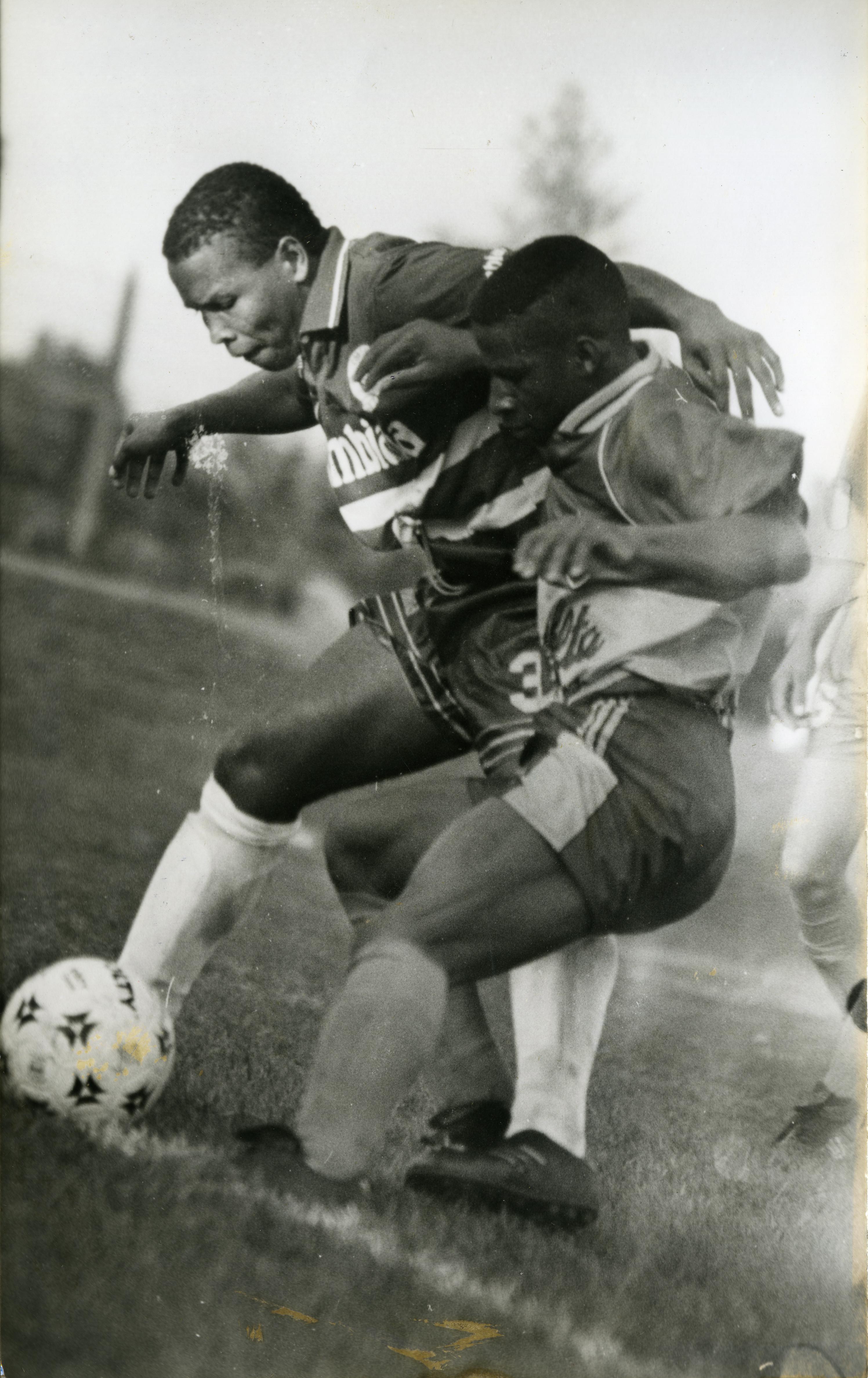 En la gráfica partido entre equipo Boca juniors vs Independiente Jamundí de primera C. El partido culminó con empate 1-1. Se aprecia disputa del balón en el campo de juego. Reverso: Una fila ejerció Argemiro Escobar del Cortuluá al delantero Boquense Víctor Cortés durante el compromiso realizado el sábado en La Candela el primer juego semifinal de la primera C. Con empate 1-1 se liquidó el compromiso que tuvo pasajes interesantes