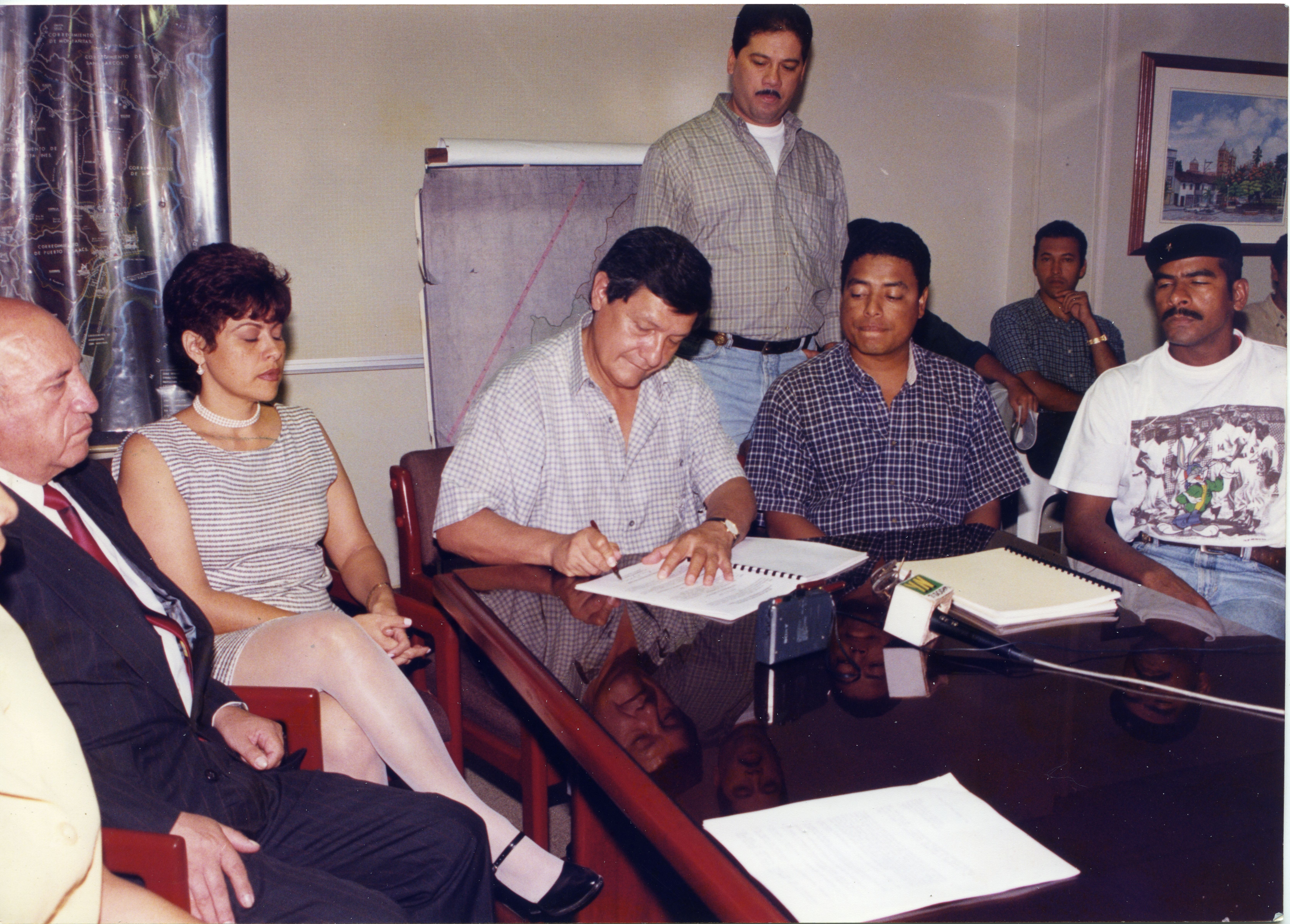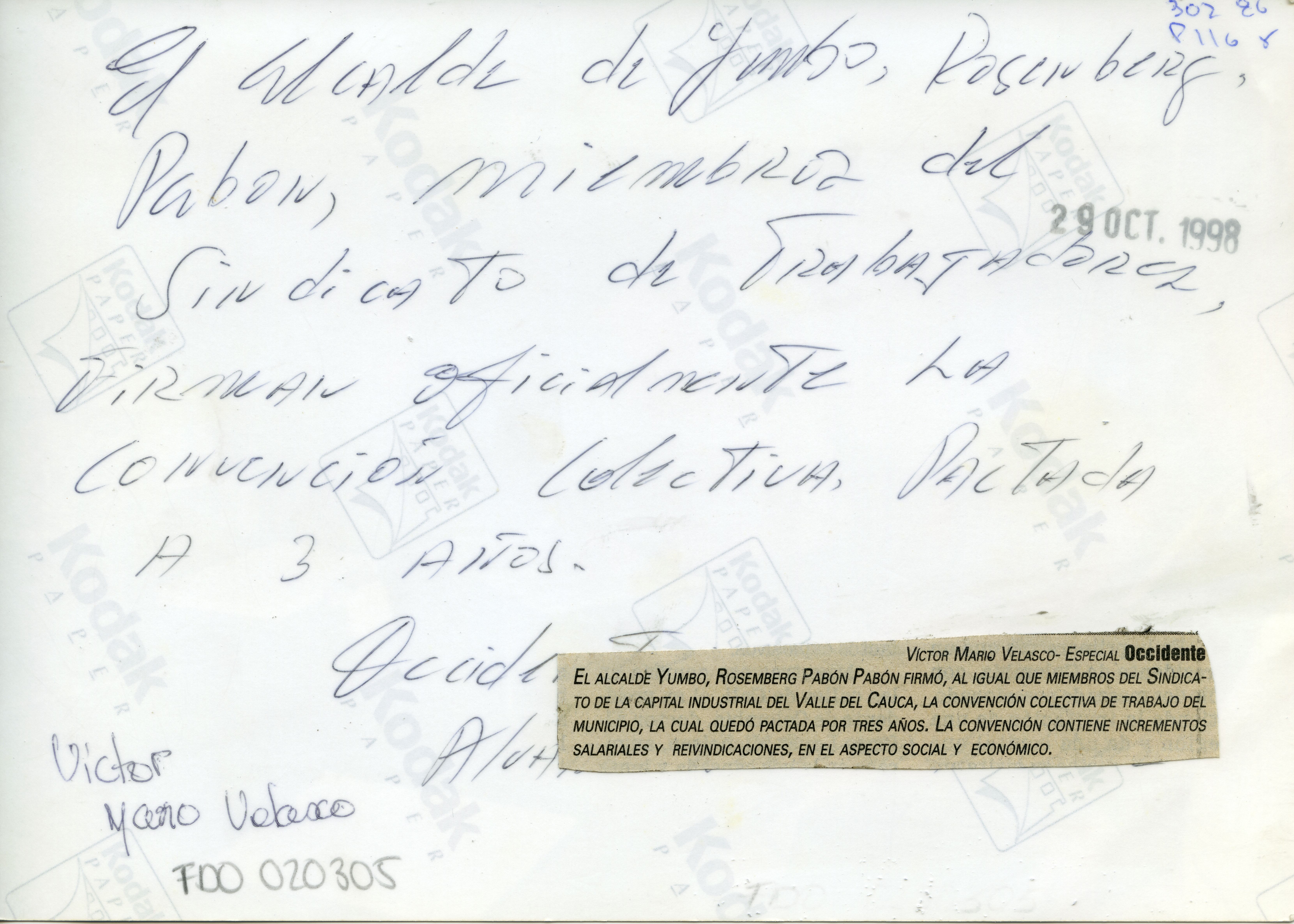 En la fotografís podemos observar al alcalde de Yumbo, Rosemberg Pabón Pabón junto a miembros del sindicato del municipio firmando acuerdo que bsuca mejoras en las condiciones de los trabajadores. Al reverso de la fotografía se anexa recorte: "El alcalde de Yumbo, Rosemberg Pabón Pabón firmó, al igual que miembros del sindicato de la capital industrial del Valle del Cauca, la convención colectiva de trabajo del municipio, la cual quedó pactada por tres años. La convención contiene incrementos y reivindicaciones, en el aspecto social y económico."