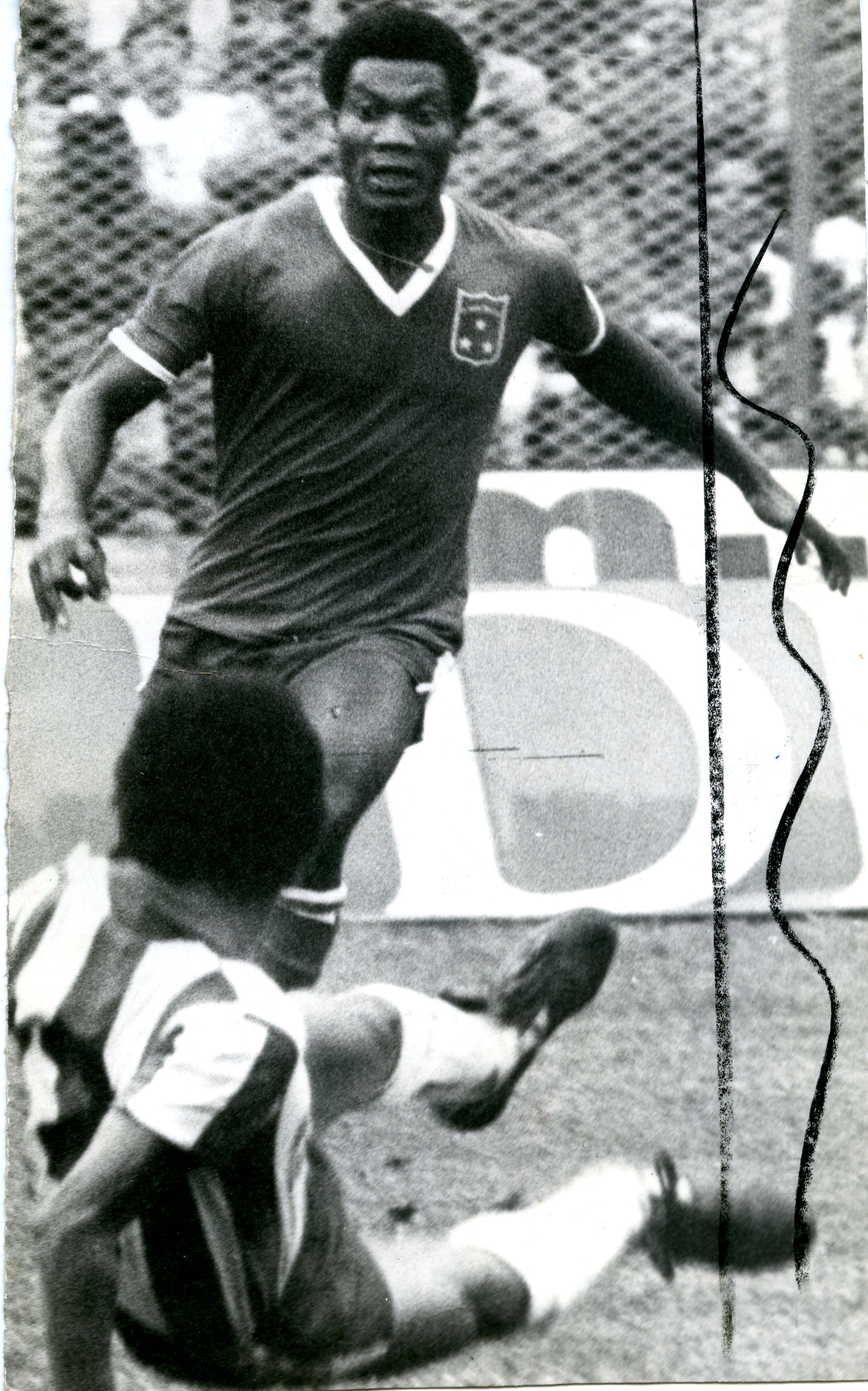 En la gráfica se observa al jugador Guillermo de la Rosa en medio de un partido del América de Cali mientras un jugador del equipo adversario se encuentra en el suelo frente a él.