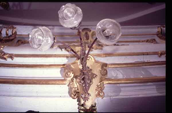 Lámpara aplique tres brazos en metal y cristal del año 1927. Teatro Municipal. Cali, C. 1990