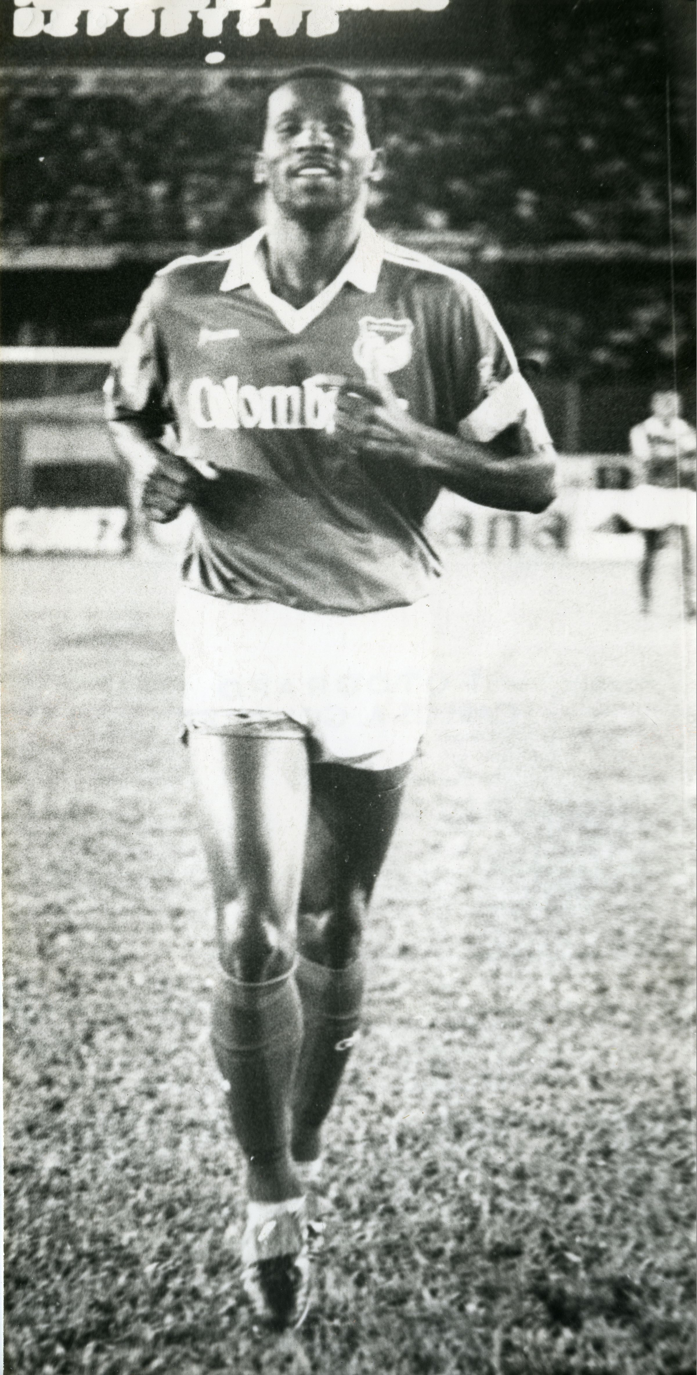 Deportivo Cali, club de fútbol colombiano del Valle del Cauca de la ciudad de Santiago de Cali, Sus inicios se remontan al 23 de noviembre de 1912 y posteriormente ha participado del fútbol profesional desde el año 1948 en donde ha obtenido 10 títulos como campeón del torneo colombiano al 2021, Campeón Copa Colombia 2010, Campeón Superliga de Colombia 2014, ha sido dos veces finalista de la Copa Libertadores de América. Jorge Eliecer Ambuila Rodríguez, jugador del Deportivo Cali. Se aprecia al jugador en la cancha del Pascual Guerrero sonriendo y corriendo suave