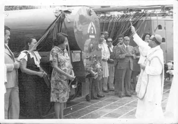 Bendición de la máquina de bomberos No. 3 a cargo de Monseñor Eriberto Correa Yepes, en compañía de padrinos e invitados. Buenaventura, 1972