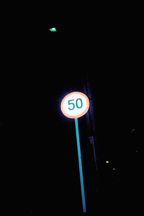 Imagen tomada de noche, con luz de flash, donde se puede apreciar una señal de transito en el centro, destacada por la incidencia de la luz. Contrasta fuertemente con el fondo oscuro de la noche. Plano medio.