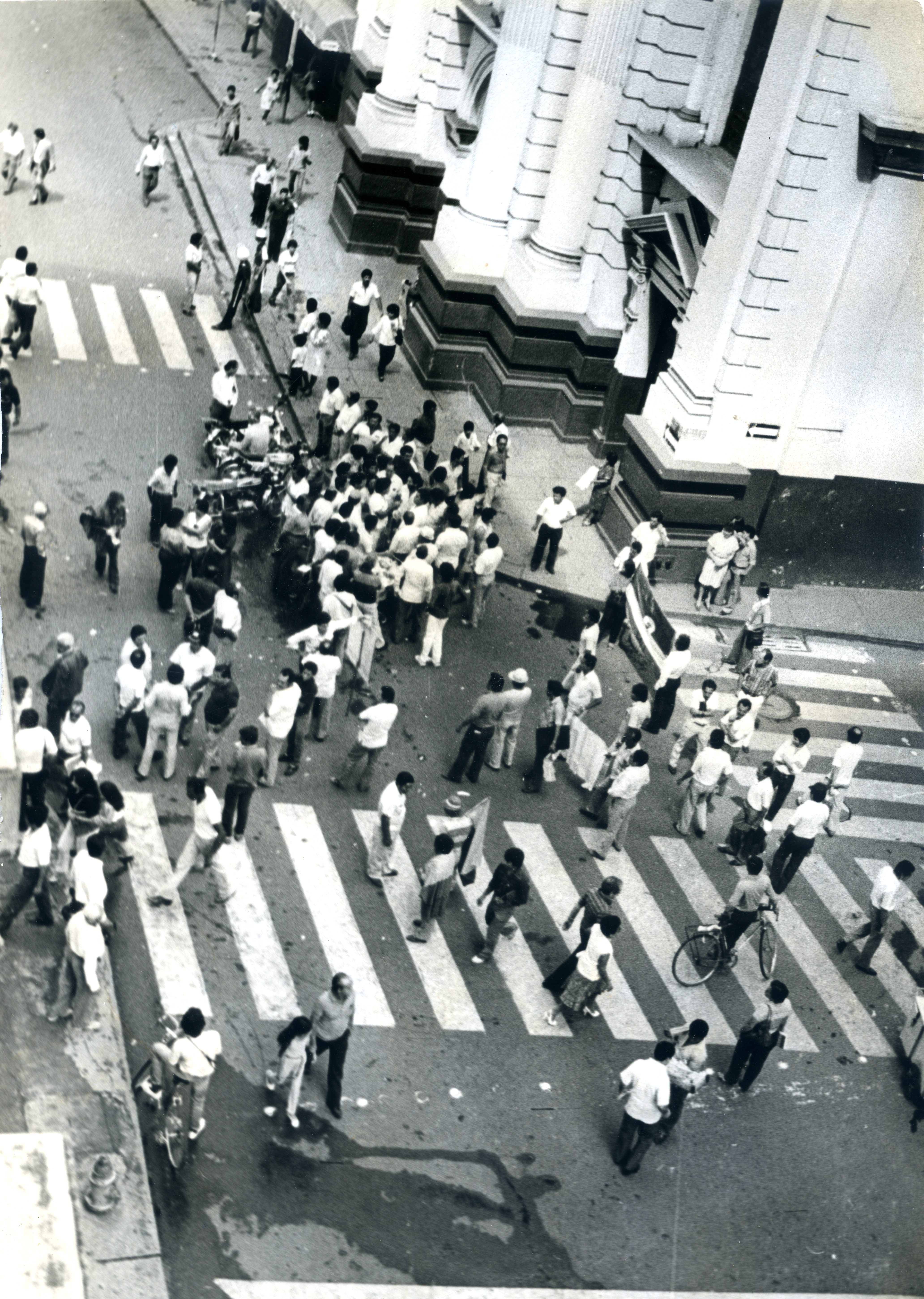 En la fotografía se observa a los manifestantes afuera de la Catedral de San Pedro. Al reverso dice: ¨Cierre irresponsable (Título). Un reducido grupo de ciudadanos provocó el cierre del acceso a la Plaza de Caycedo desde la calle 10, por la carrera 5a, prácticamente durante todo el día. Protestaba por lo que considera indiferencia del gobierno en la solución de sus peticiones. Ninguna autoridad acudió en defensa del libre tránsito de automotores. La protesta es un derecho mas no el abuso de apropiarse de las vías públicas, como sucedió en este caso.¨