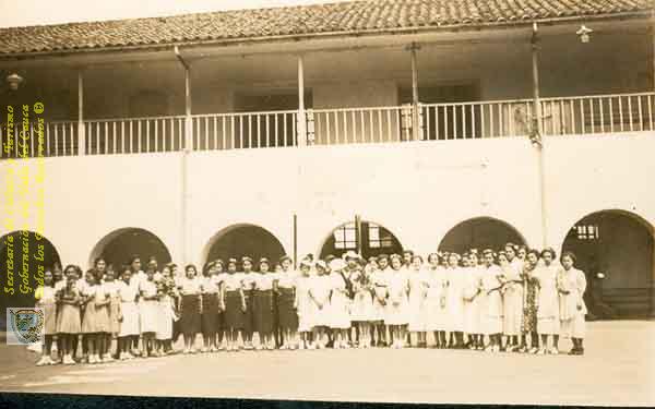 Vista frontal del colegio femenino, niñas formando. Fecha desconocida