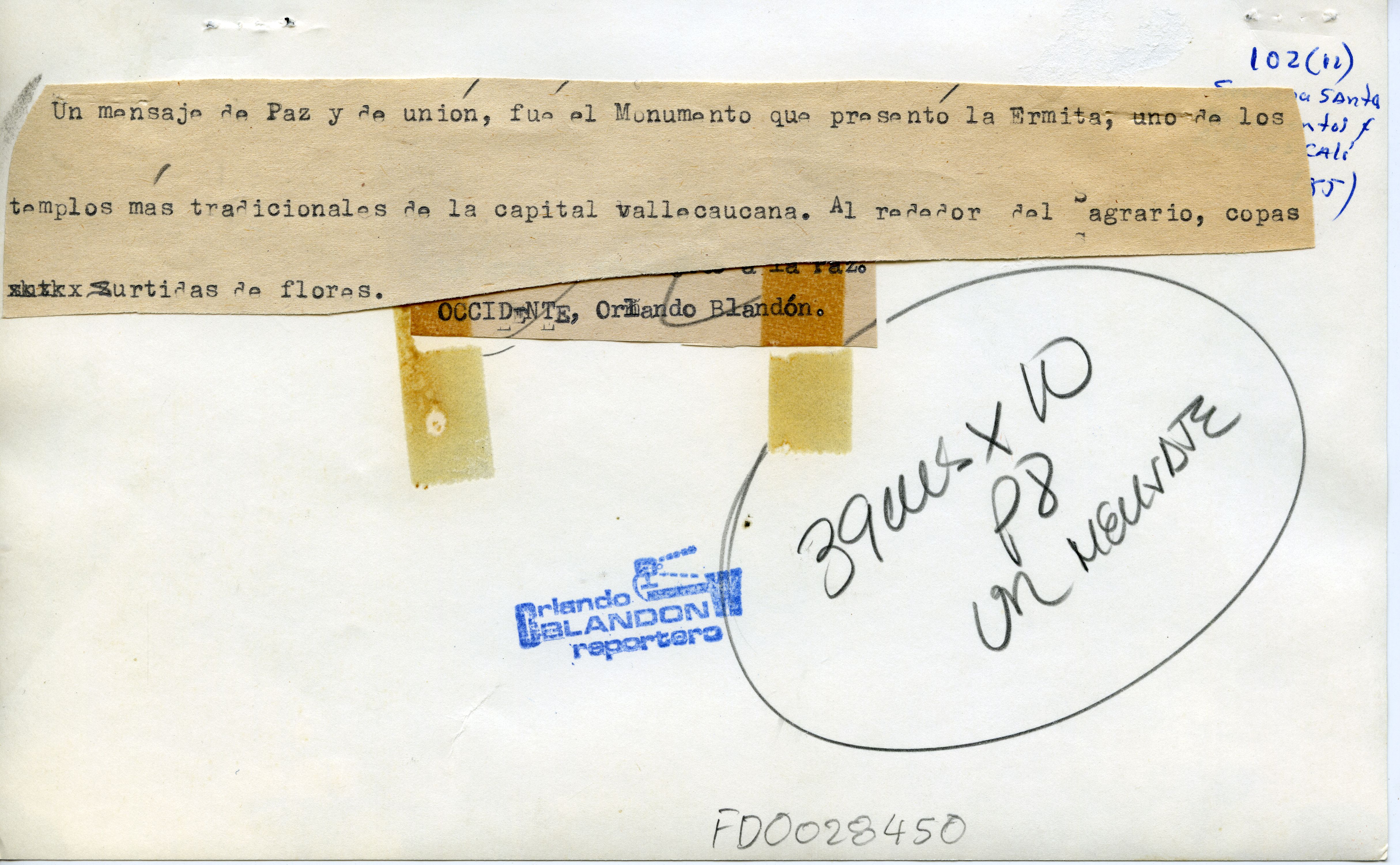 | dc.description.abstract | Reverso:"Un mensaje de paz y de unión, fue el Monumento que presentó la Ermita; uno de los templos más tradicionales de la capital del Valle del Cauca. Al rededor del sagrario, copas surtidas de flores." | spa |