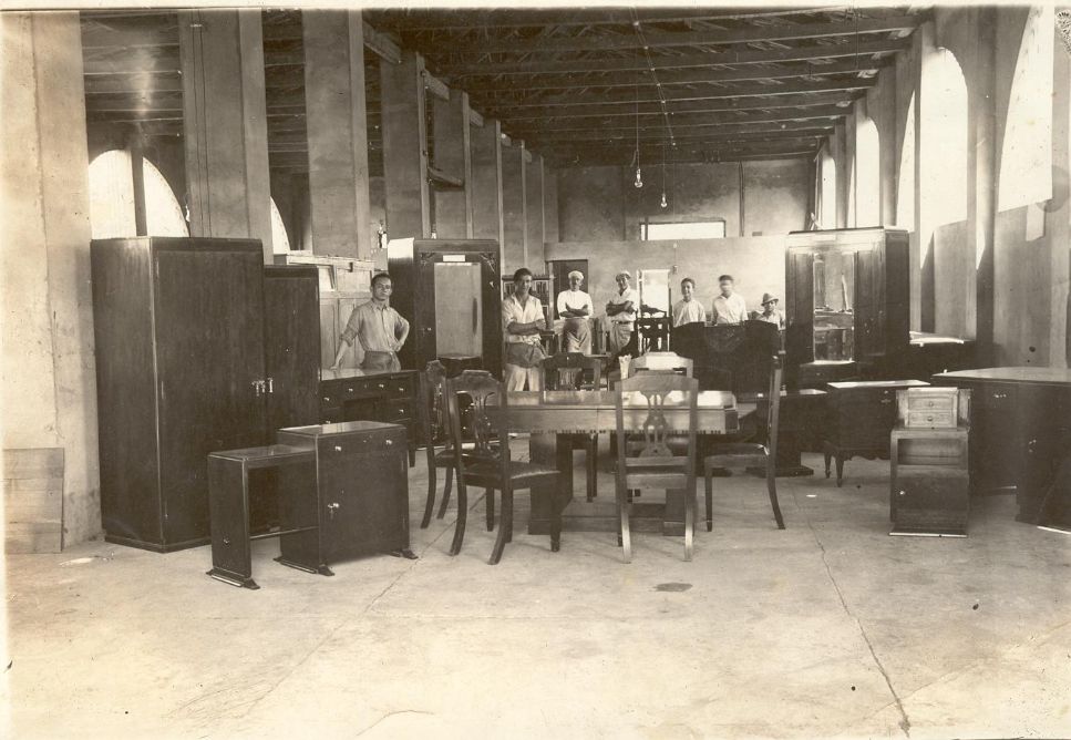 Escuela de Artes y Oficios. Exposición de los trabajos realizados, por estudiantes del taller de ebanistería. Esta institución se creo por Acuerdo Municipal No 25 de 1933, que ordeno construir una escuela de formación técnico-práctica, para dar respuesta a la necesidad de mano de obra capacitada, requerida por el crecimiento industrial y urbano de la ciudad. A partir de 1945 se le empezo a llamar Instituto Antonio José Camacho. Actualmente se conoce como Instituto Educativo Técnico Industrial Antonio José Camacho. Santiago de Cali, fecha aproximada, 1944.