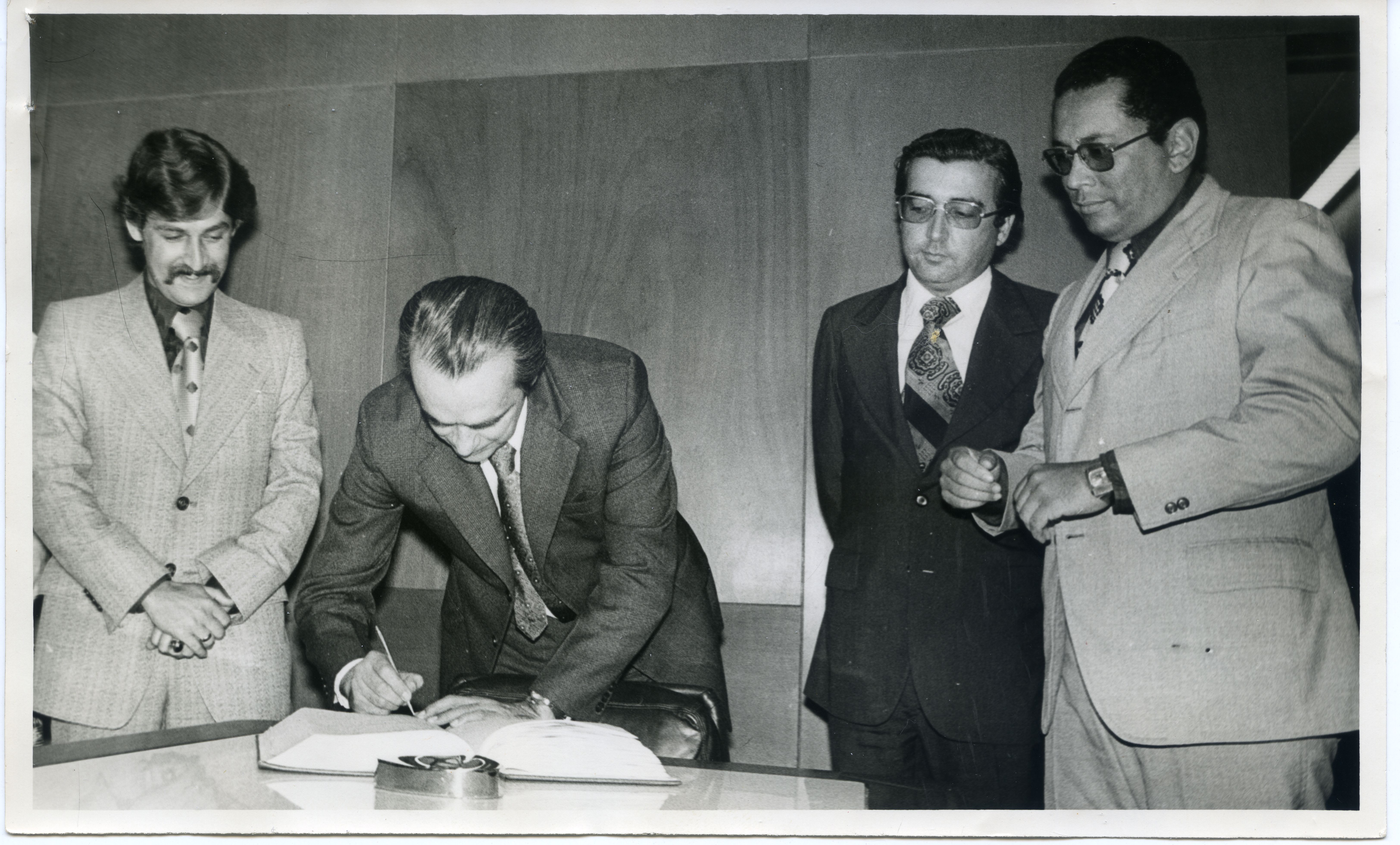 Fotografia de plano medio largo de Reúl Orejuela Bueno, donde se observa junto a tres personas más en el momento de estampar la firma en un libro grueso, al lado derecho hay un hombre vestido de saco, luce bigote grande y esta con las manos sostenidas entre si, al lado izquierdo podemos ver a otros dos hombres vestidos de saco y corbata observando a la persona que firma el libro.