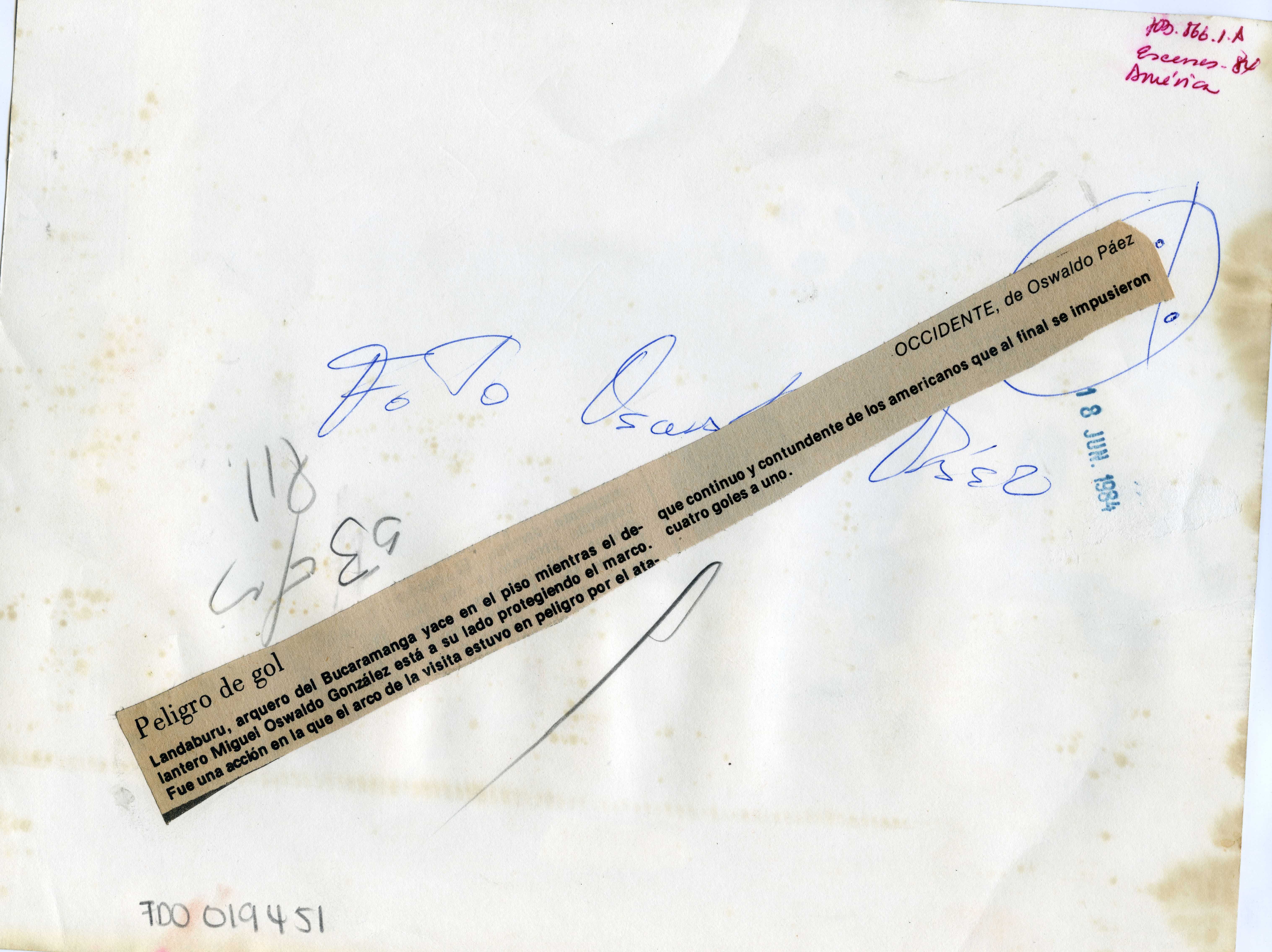 Al reverso de la fotografía se anexa recorte: " Landaburu, arquero del Bucaramanga yace en el piso mientras el delantero Miguel Oswaldo Gonzalez esta a su lado protegiendo el marco. Fue una acción en el que el arco de la visita estuvo en peligro por el ataque continuo y contundente de los Americanos que al final se impusieron cuatro goles a uno.