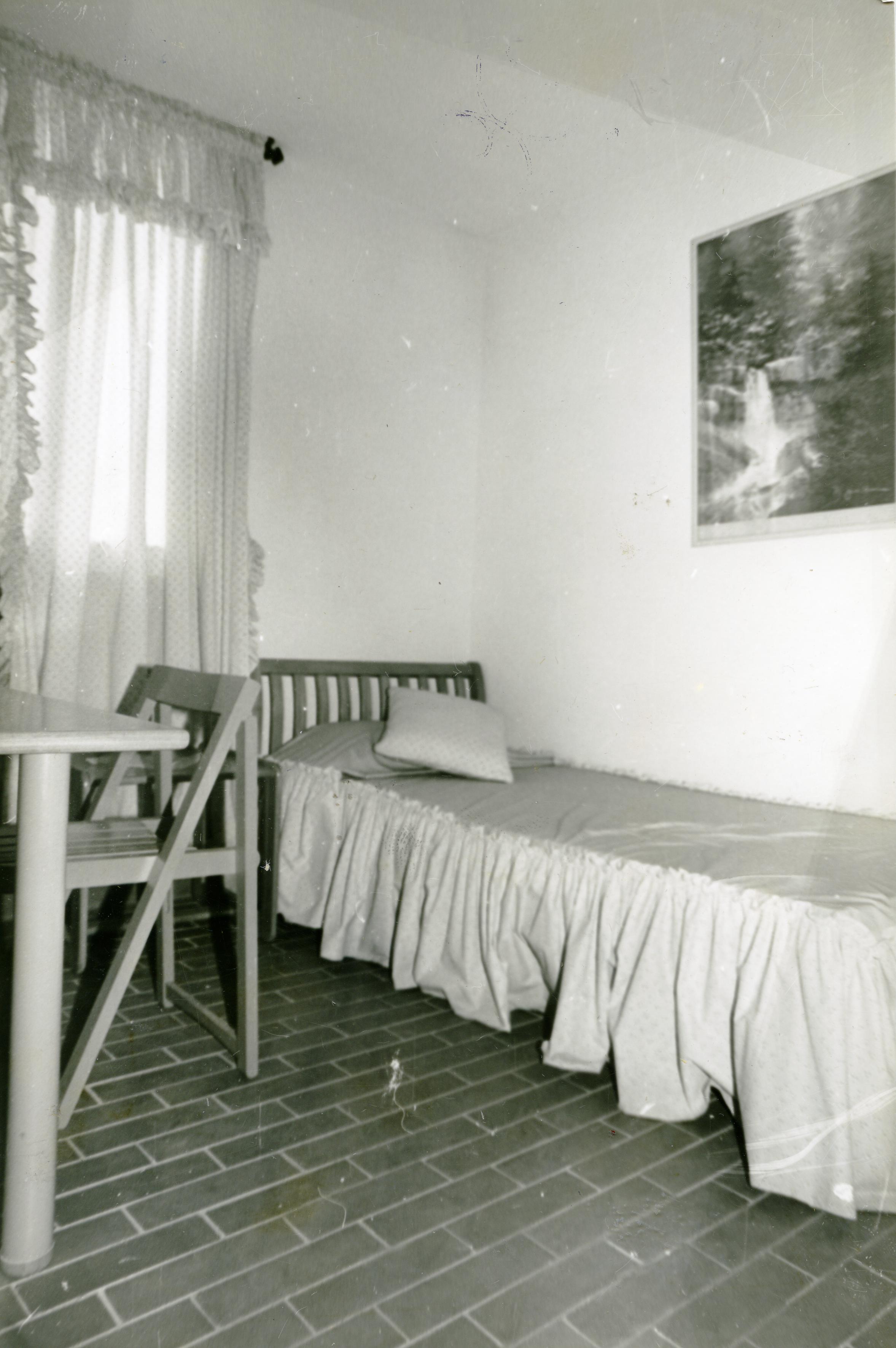 En la gráfica se observa una habitación de apartamento amueblada, perteneciente a las Torres de Comfandi. Cuenta con una cama, una mesa, una silla, cortinas en la ventana y un cuadro en la pared.
