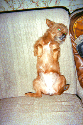 Plano Medio. Cenital. Imagen tomada con flash, en el interior de una vivienda. Donde se aprecia una silla de color café, en la cual hay una perrita de color café, acostada mirando hacia la cámara.