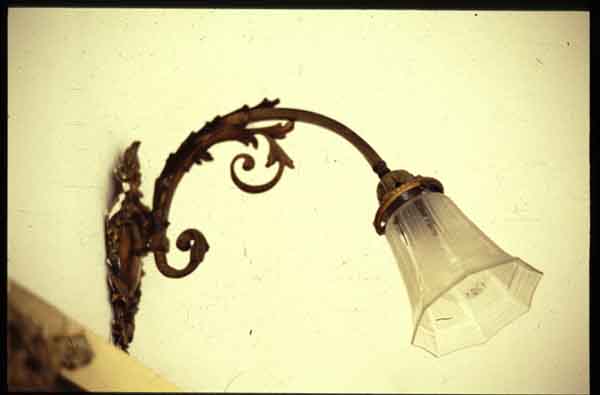 Lámpara aplique de un brazo en metal y cristal. Data de 1927. Teatro Municipal. Cali, C. 1990