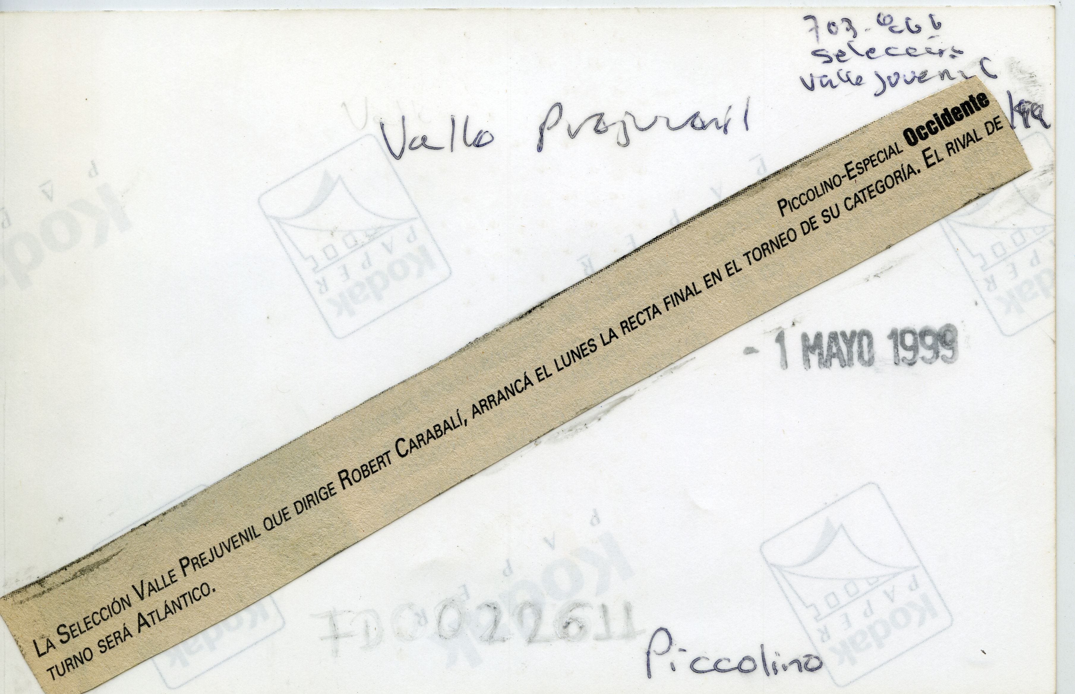 | dc.description.abstract | Al reverso de la fotografía se anexa escrito: La selección Valle preJuvenil, que dirige Robert Carabalí, arrancá el lunes la recta final en el torneo de la categoría. El rival de turno será Atlántico | spa |