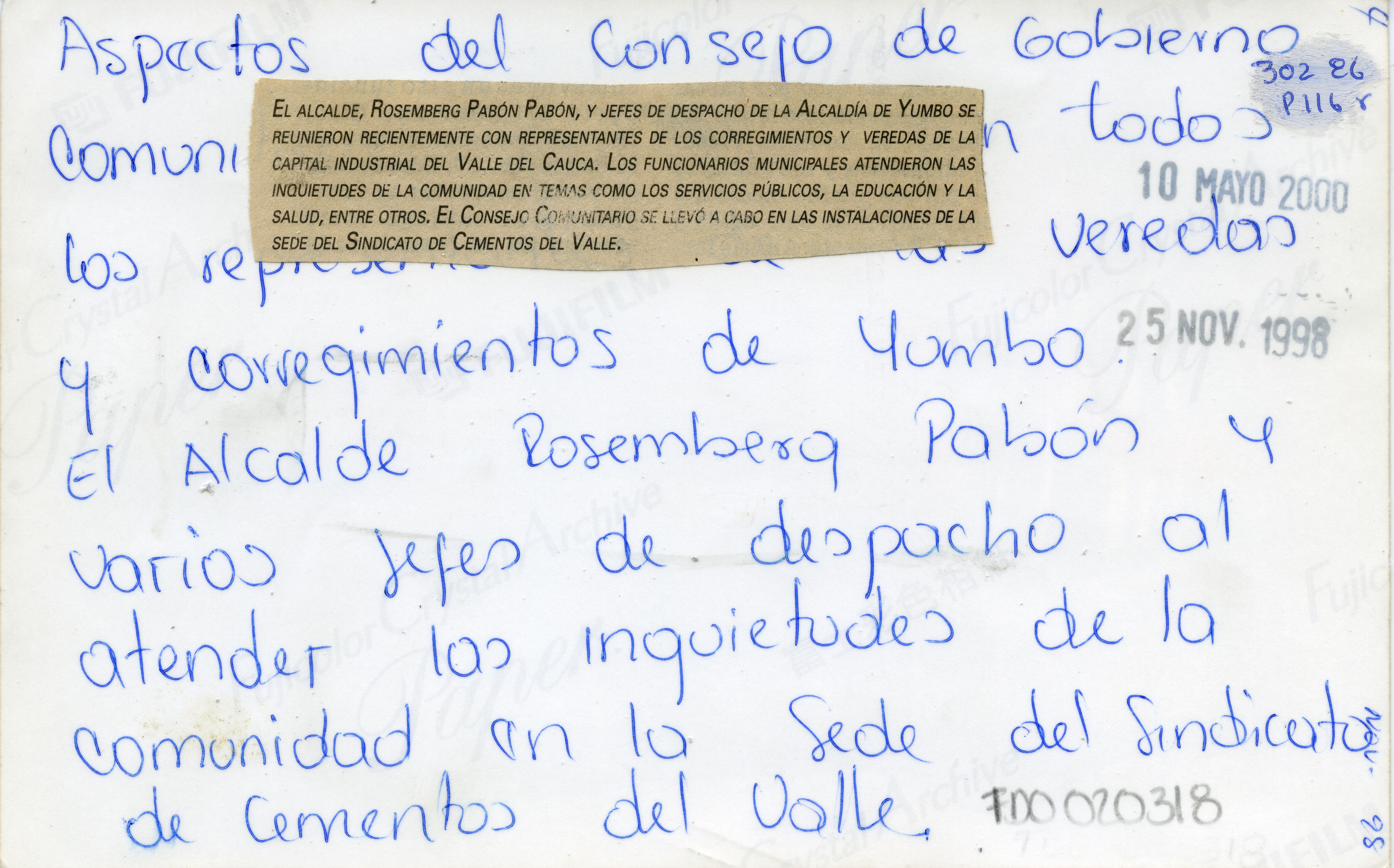 En la fotografís podemos observar al alcalde de Yumbo, Rosemberg Pabón Pabón reunido con los representantes de los corregimientos y veredas del municipio de Yumbo, habalndo sobre inquietudes y solicitudes de la comunidad. Al reverso de la fotografía se anexa recorte: "El alcalde, Rosemberg Pabón Pabón, y jefes de despacho de la alcaldía de Yumbo se reunieron recientemente con representantes de los corregimientos y veredas de la capital industrial del Valle del Cauca. Los funcionarios municipales atendieron las inquietudes de la comunidad en temas como los servicios públicos, la educación y la salud, entre otros. El consejo comunitario se llevó a cabo en las instalaciones de la sede del sindicato de cementos del Valle."