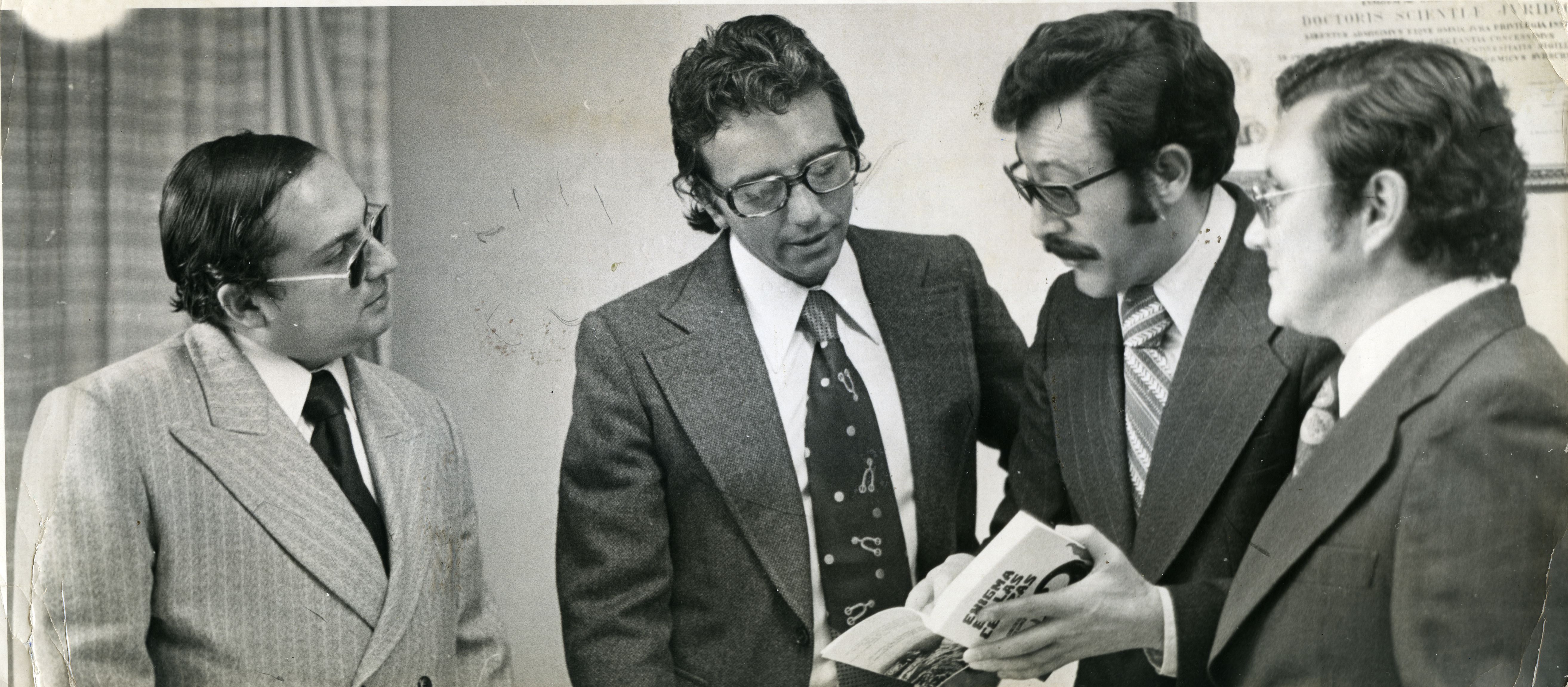 Fotografía de plano medio, en la composición gráfica se distinguen a cuatro personas, vestidas de saco y corbata. Dos de los hombres revisan un libro cuya portada dice "enigmas en las cenizas".