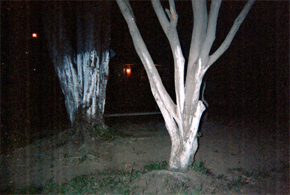 Se observan árboles en parque. Al fondo se observa una luz en el exterior de una vivienda. Plano medio. Imagen tomada con flash.