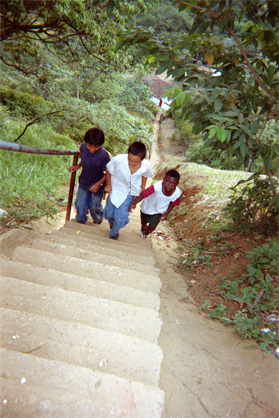 Se observan tres niños subiendo por unas gradas en medio de zona verde. Predominio de vegetación en el cuadro. Toma en picado. Plano general.