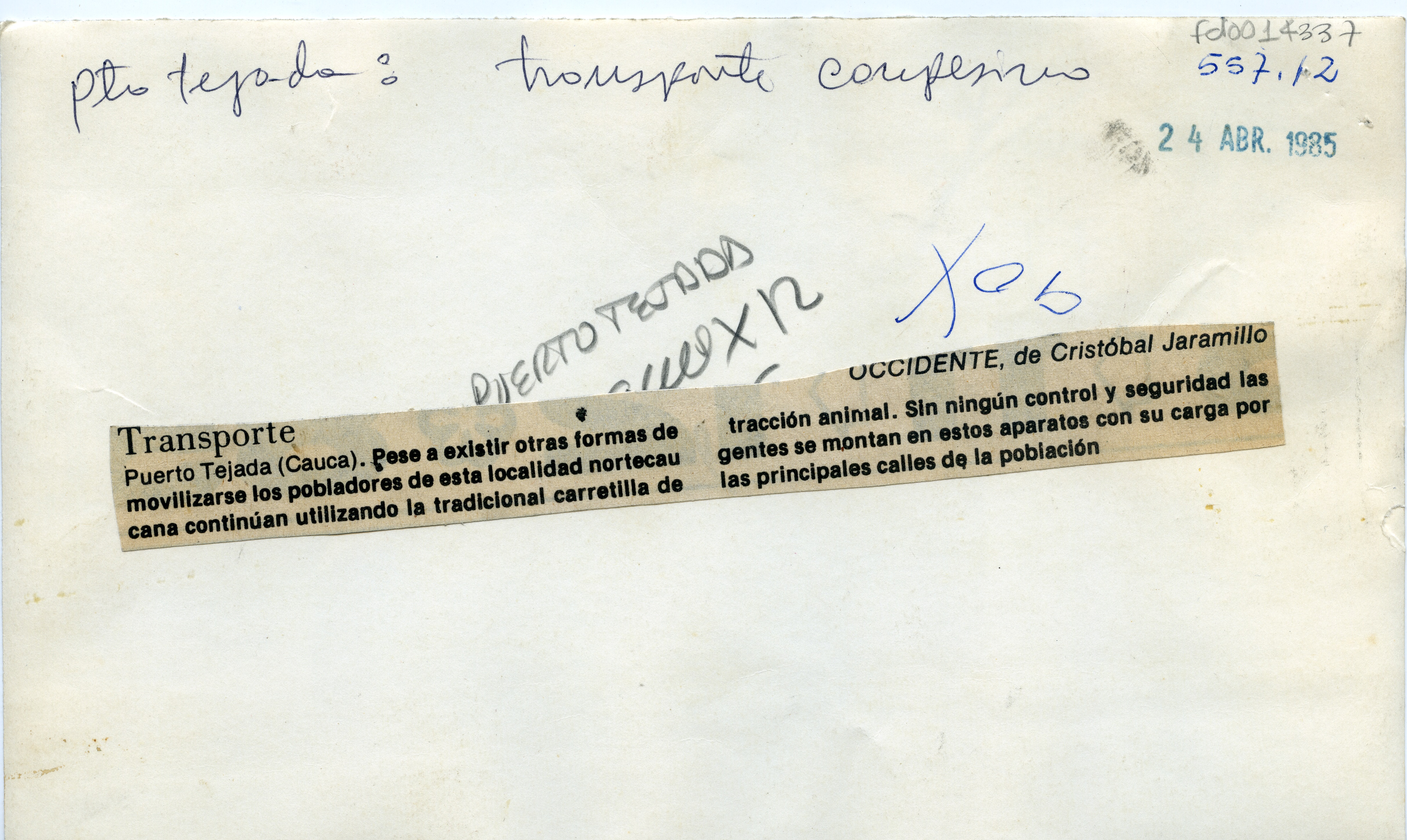 | dc.description.abstract | Al reverso conserva el pie de foto del periódico y dice lo siguiente: "Transporte. Pese a existir otras formas de movilizarse los pobladores de esta localidad nortecaucana continúan utilizando la tradicional carretilla de tracción animal. Sin ningún control y seguridad las gentes se montan en estos aparatos con su carga por las principales calles de la población." Se observa una carretilla en marcha. | spa |