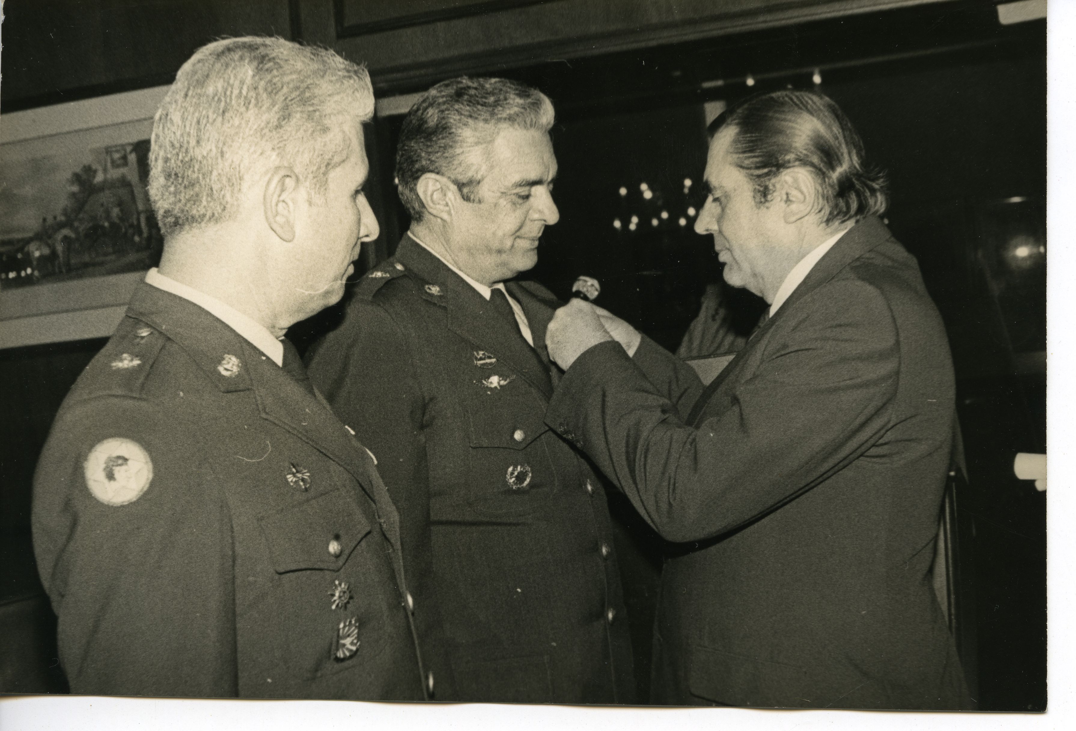 En la fotografía se puede observar al Gobernador del Valle Ernesto González Caicedo condecorando a una persona, quien esta en compañía de otro individuo, ambos sujetos parecen ser generales.