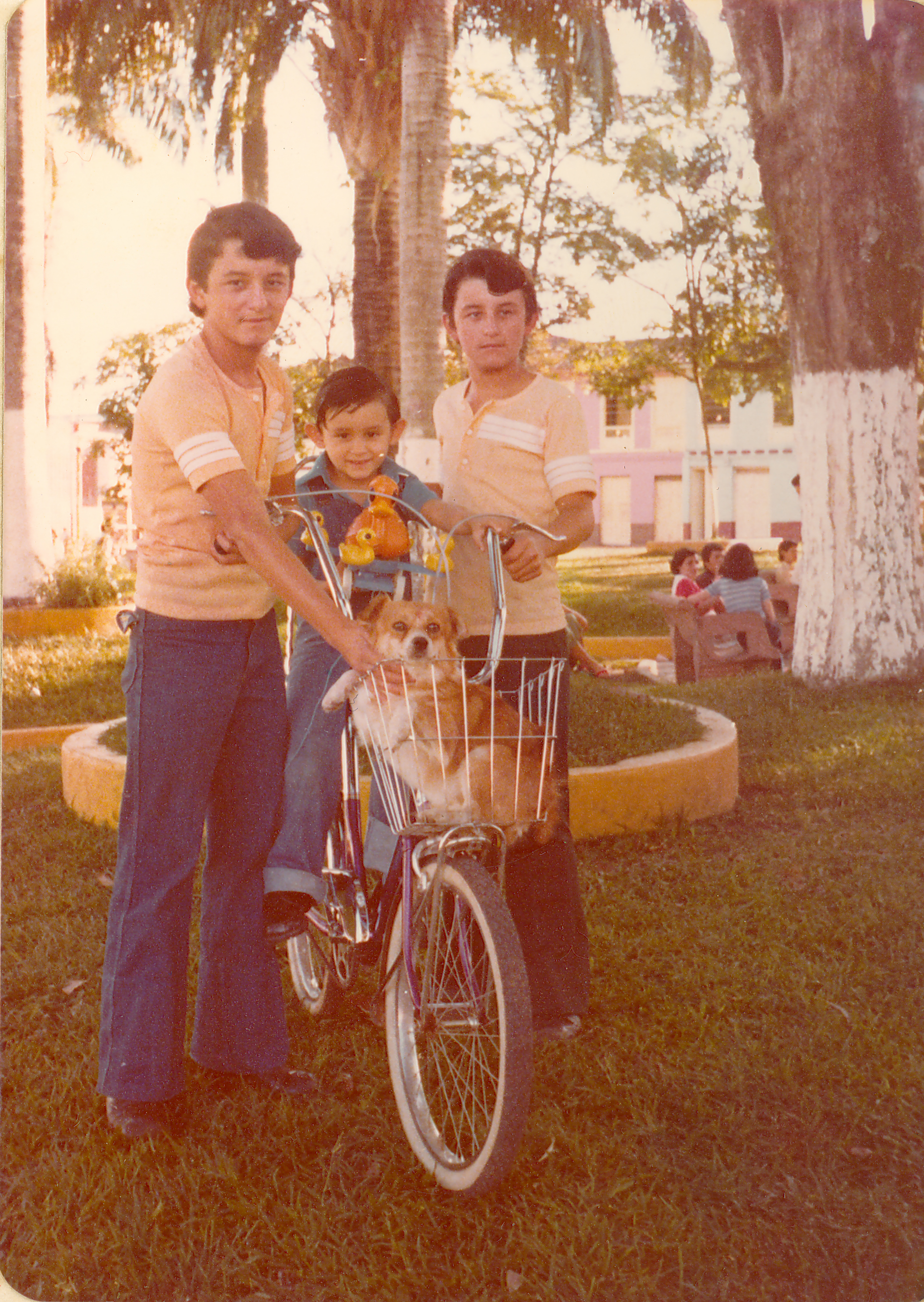 Trujillo, Valle del Cauca. Fundado en 1924, por Leocadio y Rafael Salazar. Nombres: Vernaza. Municipio desde 1930. Economía importante en agricultura, caficultura, ganadería, explotación forestal, entre otros. Atractivo turístico: Iglesias, Charco El Pailón, Monumentos a los Derechos Humanos, Parador El Tablazo. Observamos en la imagen, parque Santander. Se aprecia hermanos gemelos Jorge Ariel, José Uriel Zuluaga Trujillo y niño Germán Dario con su mascota