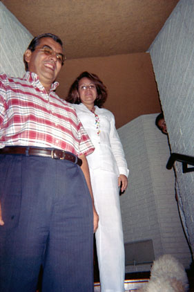 Plano medio largo. Interior. Retrato familiar. Mujer asoma cabeza entre lateral derecho de edificio. Textura en relieves de edificio.