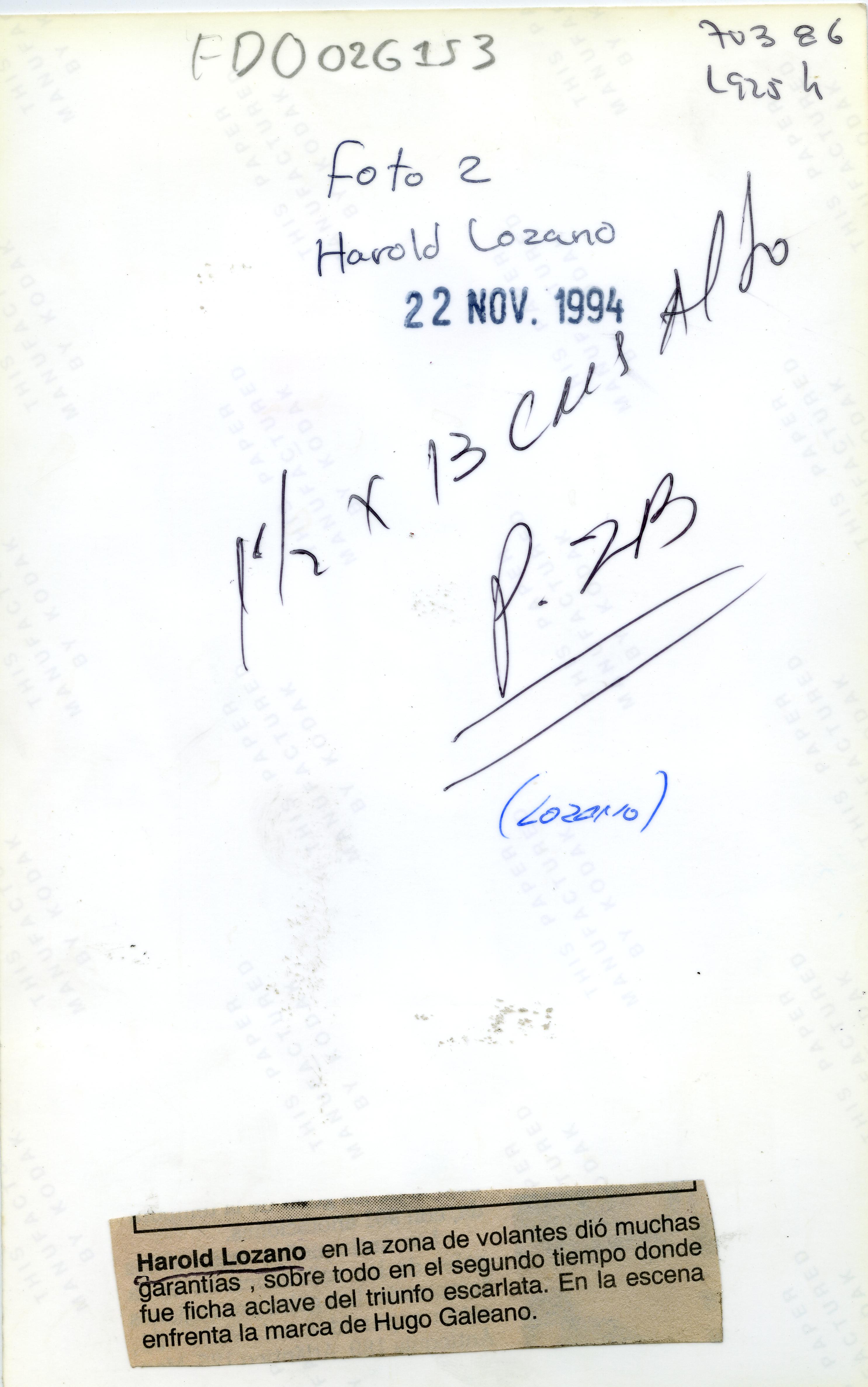 Harold Lozano, Cali, Valle del Cauca, Colombia; 30 de marzo de 1972. Es un exfutbolista colombiano, desde los años 90. Mundialista en 1994 – 1998. Copa América 1993 – 1995 – 1997 – 1999. Juegos Olímpicos 1992 y Copa de oro 2003. Clubes América de Cali, Palmeiras, FC Rustavi, Real Valladolid, RCD Mallorca y Pachuca. Se aprecia a Lozano disputa el balón con jugador del junior
