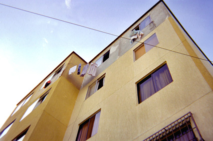 Plano Medio. Contra Picada. Se destaca un edificio de color amarillo que define unas diagonales formando un ángulo hacia la esquina superior derecha, contrastando con el color del cielo azul despejado. En el último piso se observa algunas prendas de ropa extendidas en un tendedero improvisado entre ventanas.