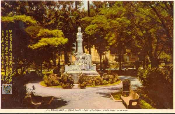 Estatua de Efraín y María con su fiel perro Mayo y el ave negra del presagio fatal. Diseñado en mármol por el escultor catalán Carlos Perea como un monumento a la obra de Jorge Isaacc. Hoy se encuentra ubicado en el Cam. Cali. C. 1968.
