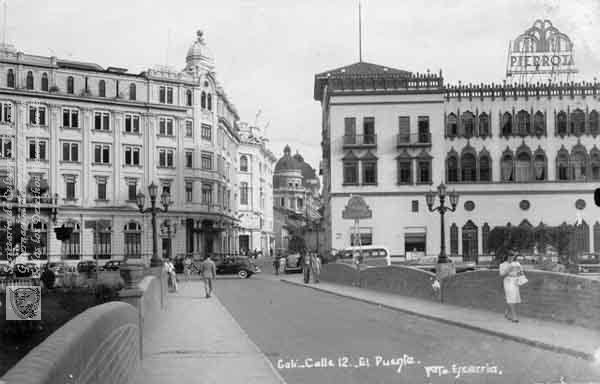 P.A Riascos (1950). Puente Ortiz, al fondo el hotel Alférez Real & 200750. OTRO: Biblioteca Departamental Jorge Garces Borrero.