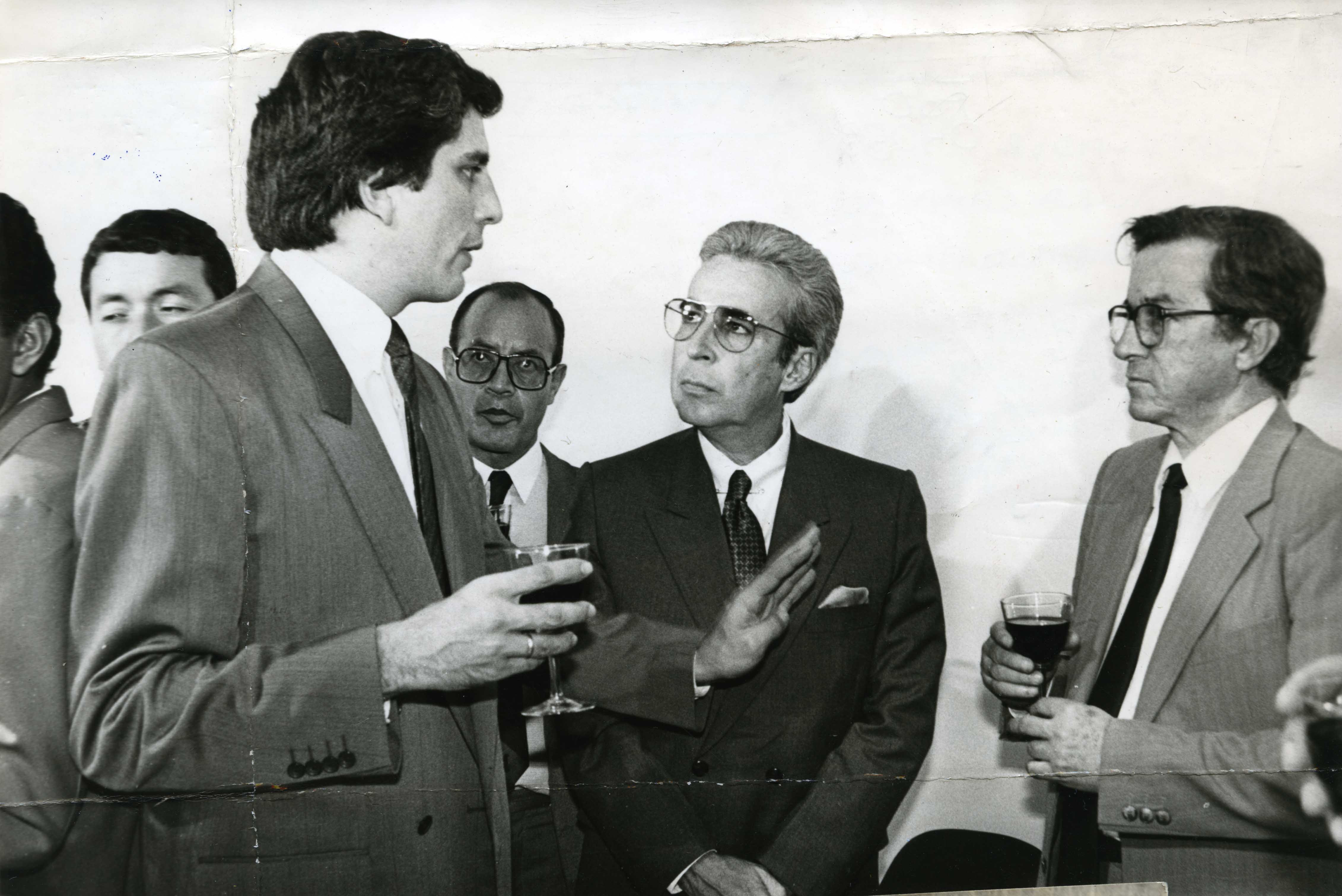 En el pie de foto dice lo siguiente: Lanzamiento de programa, un vino de honor se ofreció en la sede de la Fundación para la Educación Superior con motivo del lanzamiento del programa de la Defensoría Pública de Oficio. Aparecen en la gráfica, el gobernador del departamento del Valle del Cauca, doctor Mauricio Guzmán Cuevas; el doctor Hugo Lora Camacho, director ejecutivo de la FES y el doctor Jaime Giraldo Ángel, ministro de Justicia---El Archivo del Patrimonio Fotográfico y Fílmico del Valle del Cauca es responsabilidad de la Biblioteca Departamental del Valle Jorge Garcés Borrero, por convenio de cooperación suscrito con la Secretaria del Cultura Departamental, con el fin de aunar esfuerzos para su conservación, preservación y divulgación del Archivo entre la comunidad Vallecaucana, especialmente entre los estudiantes e investigadores que visitan la Biblioteca, propiciando el su uso y consulta permanente. La universidad Icesi es un colaborador en el proceso de difusión, facilitando la tecnología que permite la consulta de las imágenes.