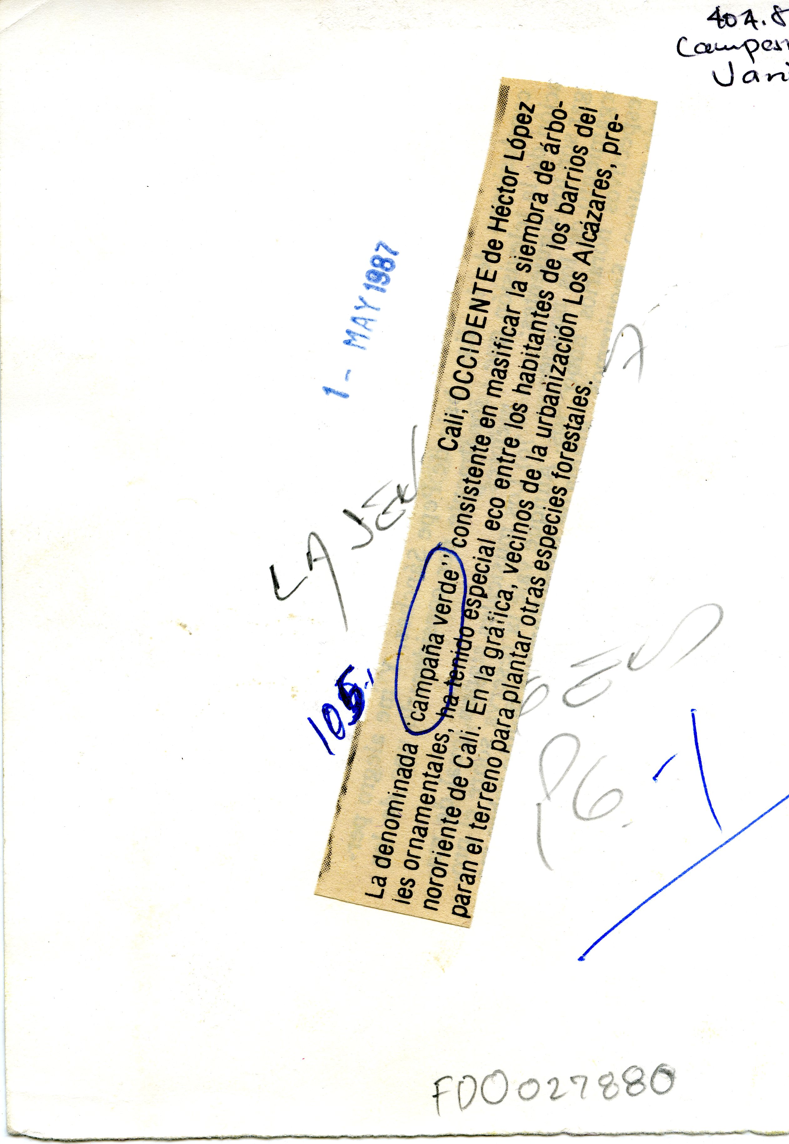 Reverso:"La denominada "Campaña verde" consiste en masificar la siembra de árboles ornamentales, ha tenido especial eco entre los habitantes de los barrios del nororiente de Cali. En la gráfica, vecinos de la urbanización Los Alcázares, preparan el terreno para plantar otras especies forestales."