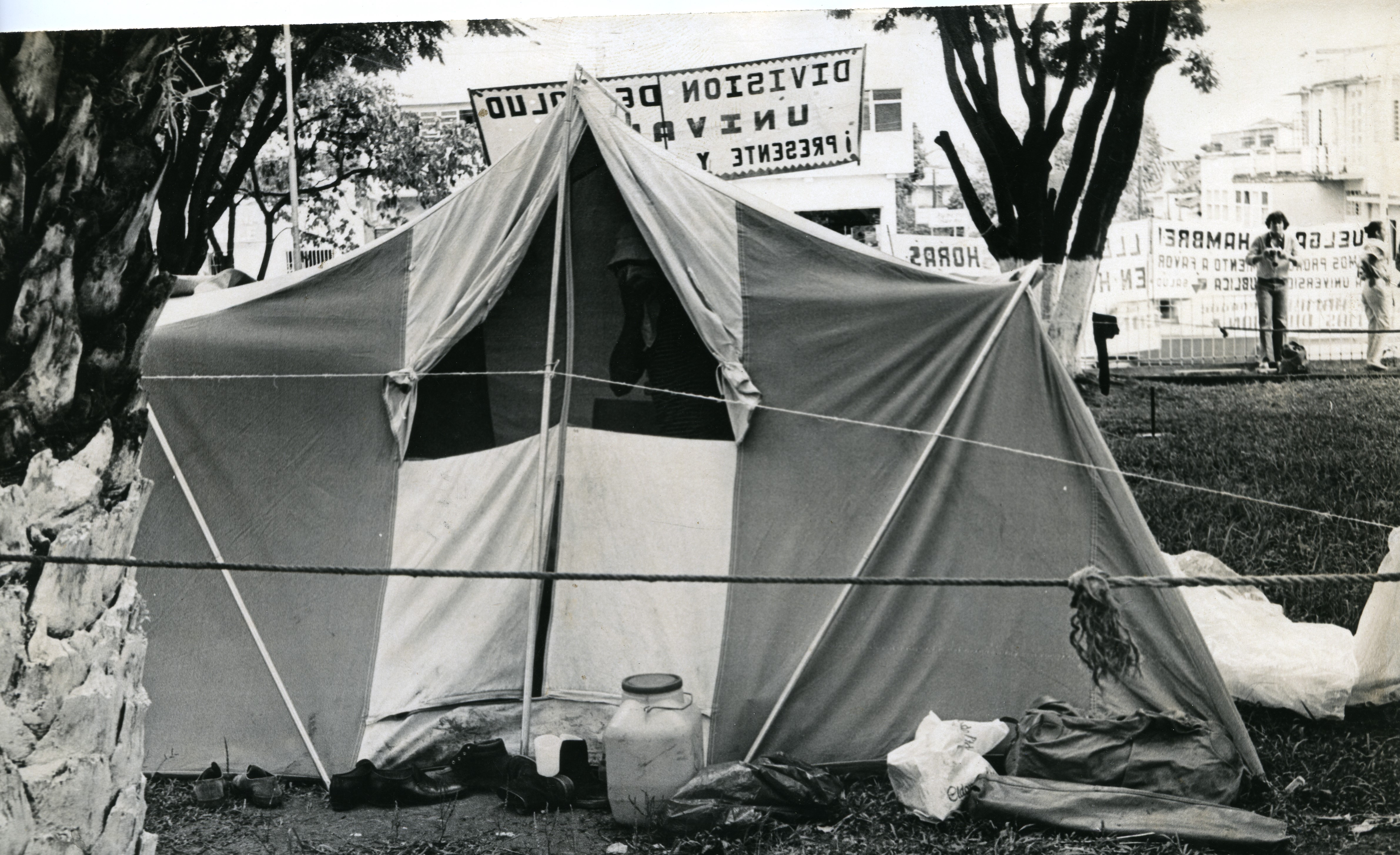 En la fotografía se observa un manifestante adentro de una carpa tapando su cara. Al fondo varios carteles sobre la protesta.