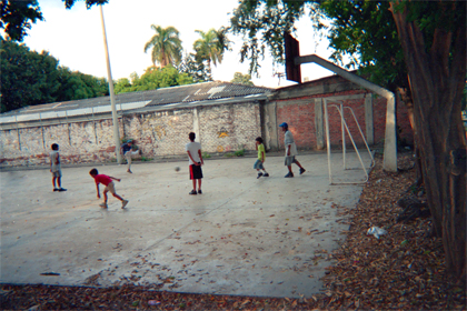 Niños jugando fútbol en la cancha de la junta de acción comunal del barrio Villa Colombia