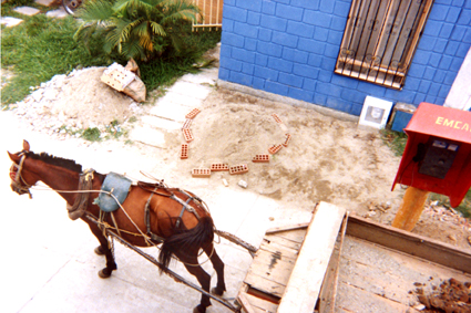 Plano medio. Toma realizada en picado, donde se destaca un caballo de color café con una carretilla atada a él. Al extremo superior una vivienda con muros de color azul.