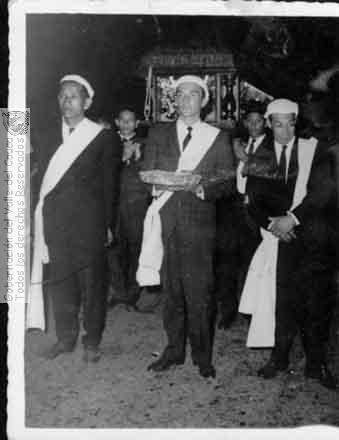 Miembros del Cuerpo de Momberos frente a la Procesión del santo Sepulcro en la Semana Santa. Bugalagrande. C. 1964