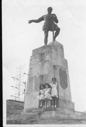 La estatua de Belalcázar se erigió en el año de 1936; esta obra fue realizada por el escultor español Victorio Macho. Constituye un sitio muy visitado por los caleños y turistas en general. Las Hermanas Victoria se toman la foto del recuerdo bajo la estatua. Santiago de Cali, 1953.