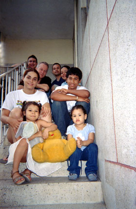Toma en contrapicado. Plano medio conjunto. Retrato familiar en escalera. Realce de superficie en costado derecho con formas cuadradas. Expresión alegre. Escenificación.