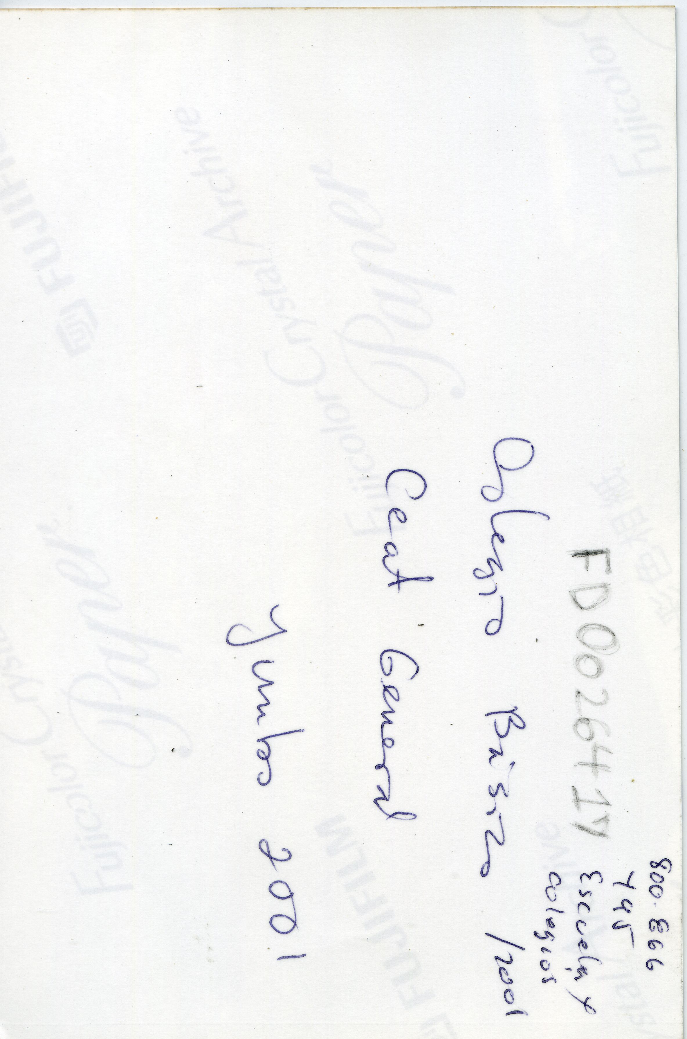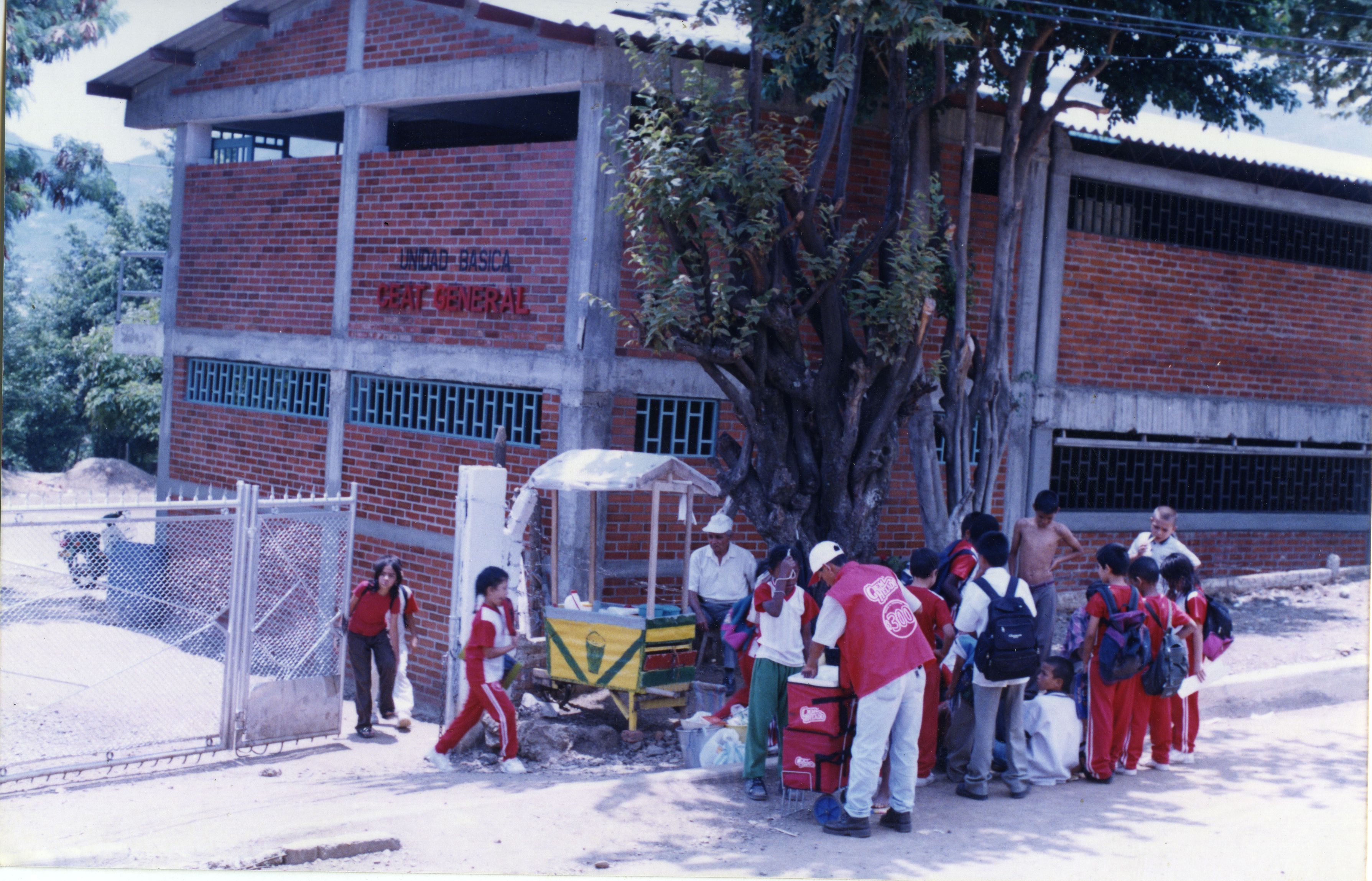 Fotografía de plano medio largo del colegio Unidad Básica Ceat General por la parte frontal, donde se puede ver una puerta malla en su entrada, al igual que se observa a varios niños en la entrada del colegio debajo de un árbol, también podemos ver a un vendedor con gorra blanca chaleco rojo el cual tiene una frase escrita que dice Crema Helado y un número 300