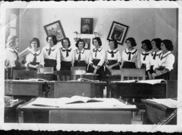 Grupo de estudiantes del Colegio Santamariana de Jesús, en uno de los salones, donde se aprecia, además del uniforme, los pupitres y decorado del recinto