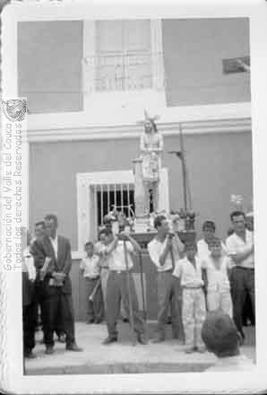 Procesión de Semana Santa, pasando por la antigua Casa Cural. Imágen del Cristo flajelado, como uno de los "pasos" de la procesión. Obando. 1962