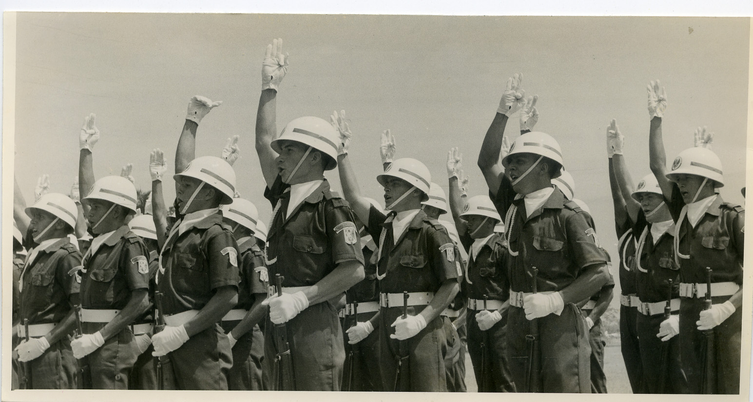 Información al reverso: El primer contingente de soldados de 1985 aparece en el momento de jurar bandera, en ceremonia realizada en la Escuela Militar de Aviación.