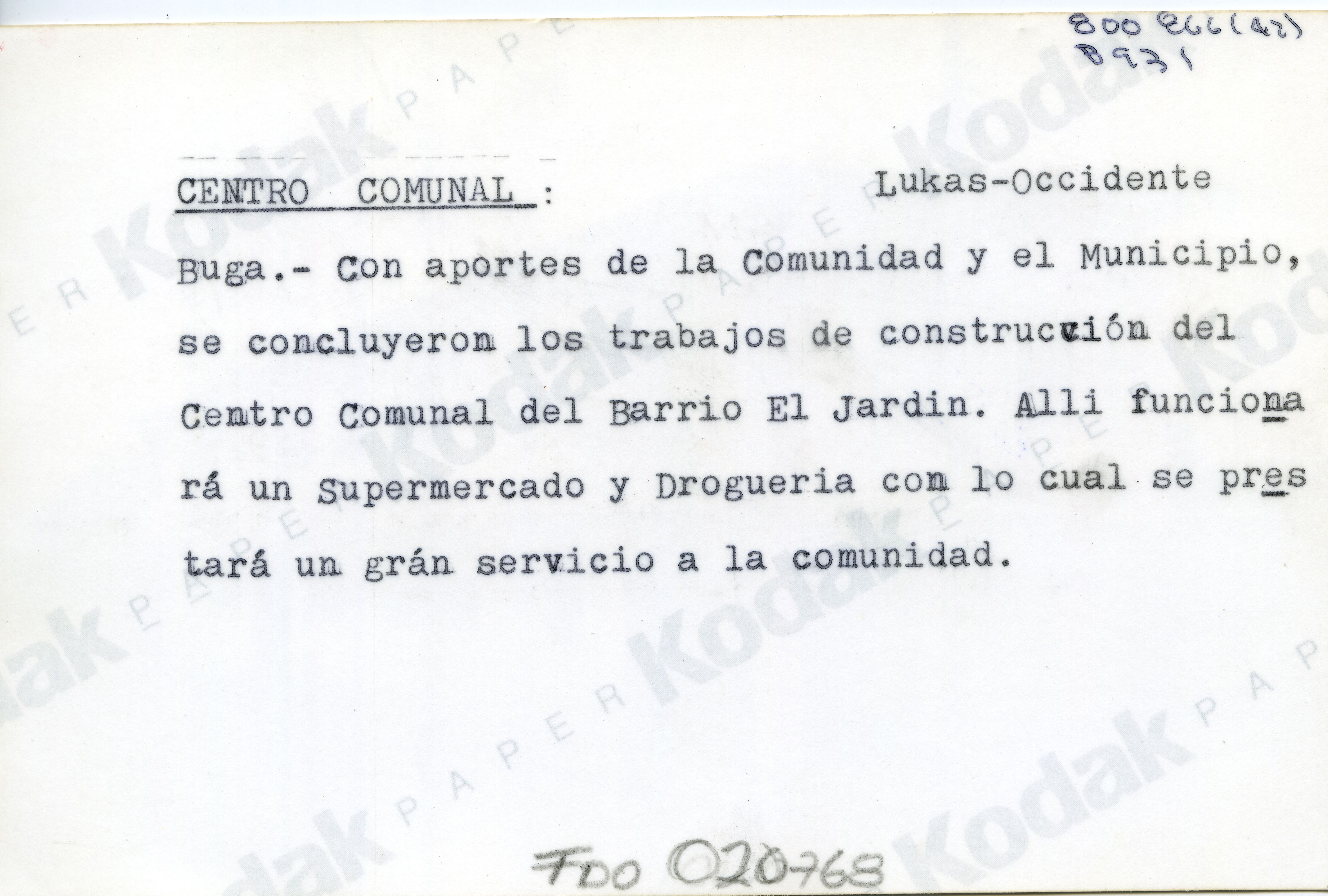 Buga. Con aportes de la comunidad y el municipio, se concluyeron los trabajos de construcción del Centro Comunal del Barrio El Jardin. Alli funcionará un supermercado y drogueria con lo cual se prestará un grán servicio a la comunidad