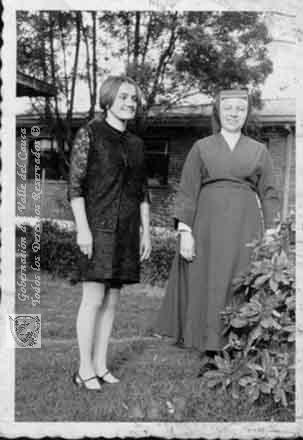 Teresa Espinoza Vera acompañada de una religiosa, en el patio interior de la viviena