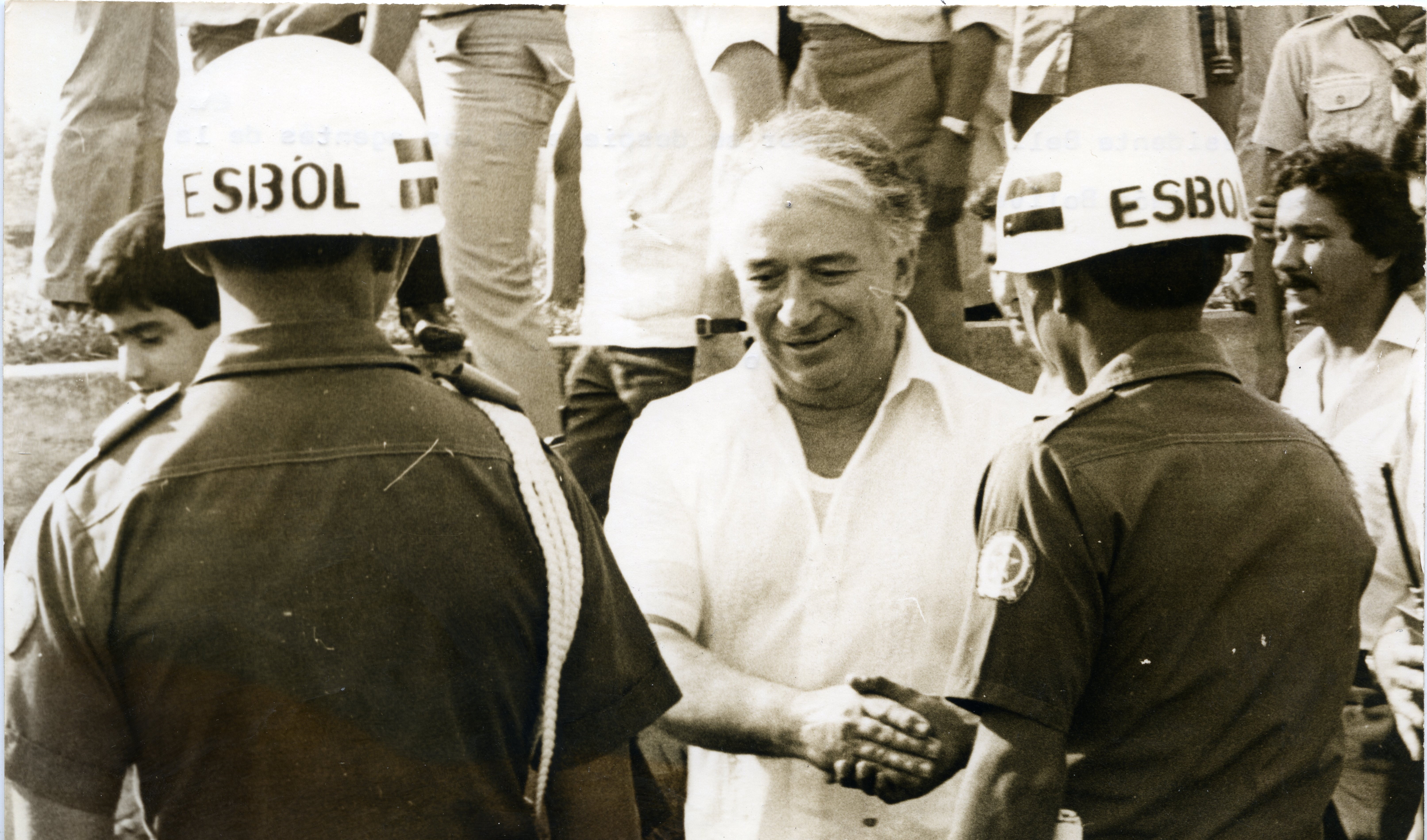 Presidente Belisario Betancur estrechando manos con agentes de la escuela Simón Bolívar en Tuluá