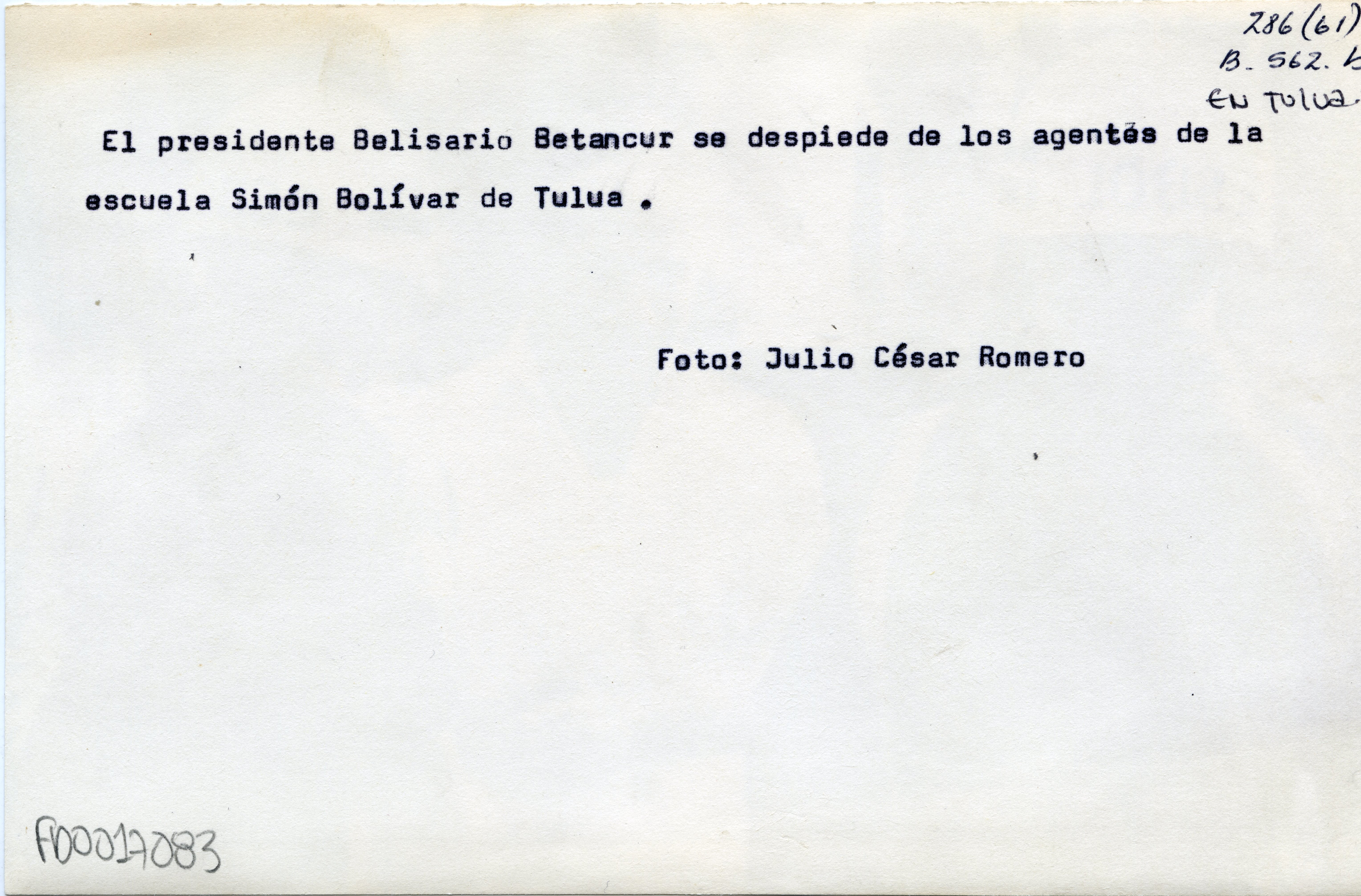 Al Reverso de la fotografía dice en letra mecanografiada: "El presidente Belisario Betancur se despide de los agentes de la escuela Simón Bolívia de Tuluá."